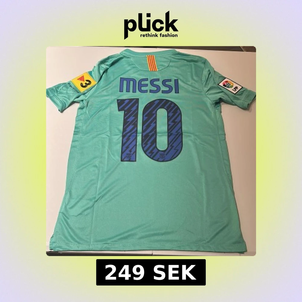 FC Barcelona bortatröja med Messi 10-tryck, tillverkad i lätt och ventilerande Dri-FIT-material. Priset pga att den röd-gula remsan sitter snett samt defekt enligr sista bilden. Turkos bas med blått och vinrött band över bröstet, gula detaljer och klubbmärke. Korta ärmar, La Liga-patch på ärmen och UNICEF-logga framtill. Replika, endast handtvätt gäller!