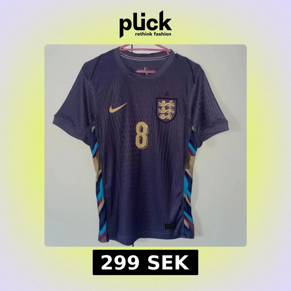 Snygg England fotbollströja från Nike med Alexander-Arnold och nummer 8 i guld på ryggen. Tröjan är mörkblå med subtila ränder och har färgglada detaljer i blått, rött och beige längs sidorna. Kortärmad och tillverkad i lätt, ventilerande material för max komfort på planen.