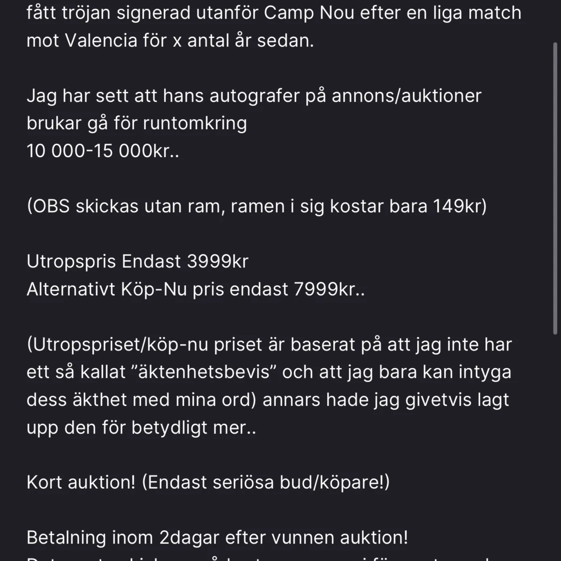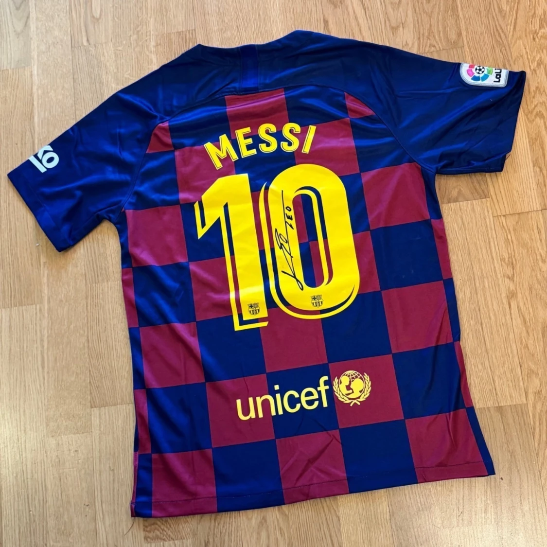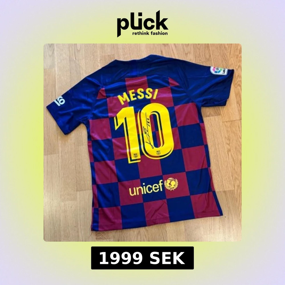 Hej, säljer min Lionel Messi tröja jag har haft ett litet tag hängandes på väggen. Behöver samla ihop pengar för en bil så blir av med lite saker. Denna mäktiga samlarobjektet behöver hitta sig ett nytt hem ❤️💙. Köpt på tradera ett tag sedan (3999kr) där säljaren påstod sig har träffat leo själv och fått den signerad. Visar på sista sliden. Tröjan har inget certifikat och därför det låga priset. En med certifikat/äkthetsbevis går för 15.000kr+. Tröjan är i storlek M och medföljer ingen ram.