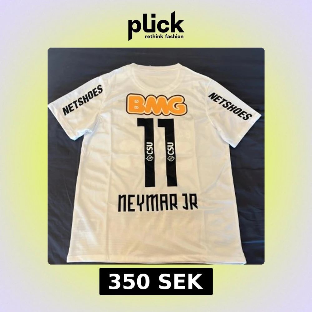 Säljer en vit Santos fotbollströja med Neymar Jr och nummer 11 på ryggen. Tröjan har svarta detaljer, klubbmärke på bröstet, sponsorer som BMG och Netshoes samt korta ärmar. Materialet är lätt och andas, perfekt för fotboll eller samling.