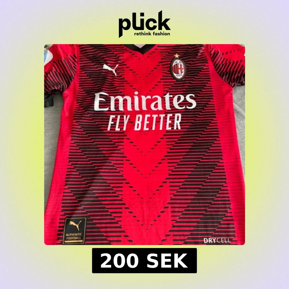 Säljer en AC Milan fotbollströja med R. Leão 17 på ryggen. Tröjan är röd med svarta detaljer och har ett mönster av svarta ränder. Puma-logga och klubbmärke på bröstet, sponsortryck på fram- och baksidan. Kortärmad och tillverkad i funktionsmaterial.