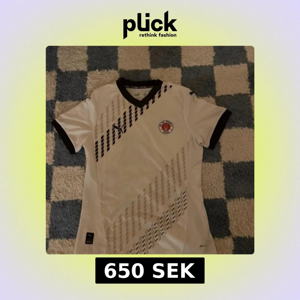 FC St. Pauli fotbollströja från Puma i vitt med bruna detaljer och diagonalrandigt mönster. Kortärmad modell med klubbmärke på bröstet och svart Puma-logga. Tillverkad i återvunnet material med DryCell-teknologi för bästa komfort. Storlek M men Väldigt liten i storleken! Som en S