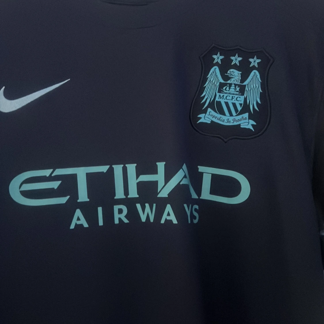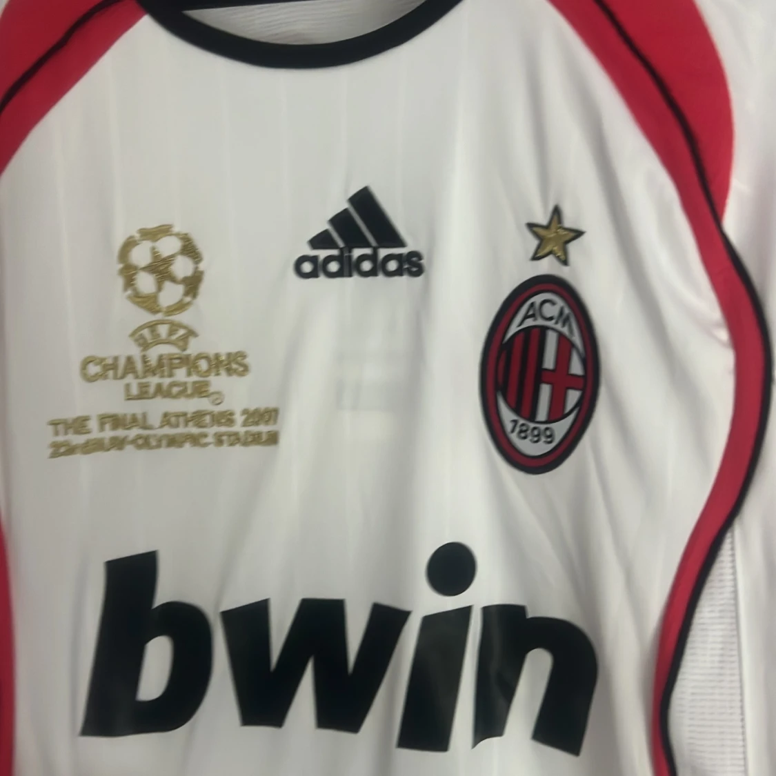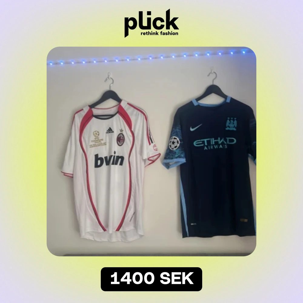 Säljer två fotbollströjor. Den första är en vit AC Milan-tröja med röda och svarta detaljer, kortärmad och med 'Maldini 3' på ryggen. Den har Champions League-brodyr och är från Adidas. Den andra är en mörkblå Manchester City-tröja med ljusblå detaljer, kortärmad och med 'Kun Agüero 10' på ryggen. Den är från Nike och har Etihad Airways som sponsor.