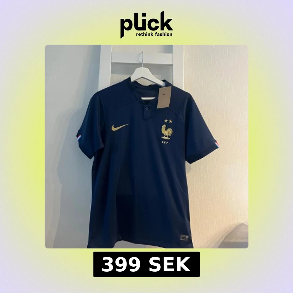 Frankrikes officiella fotbollströja från Nike i marinblått med guldiga detaljer. Broderad tupp och två stjärnor på bröstet, samt Nike-logga. Korta ärmar med franska flaggans färger på ärmslut. Tillverkad i lätt och ventilerande Dri-FIT-material.