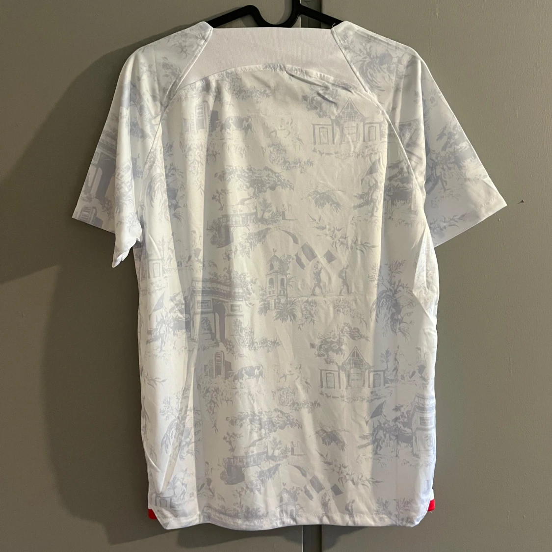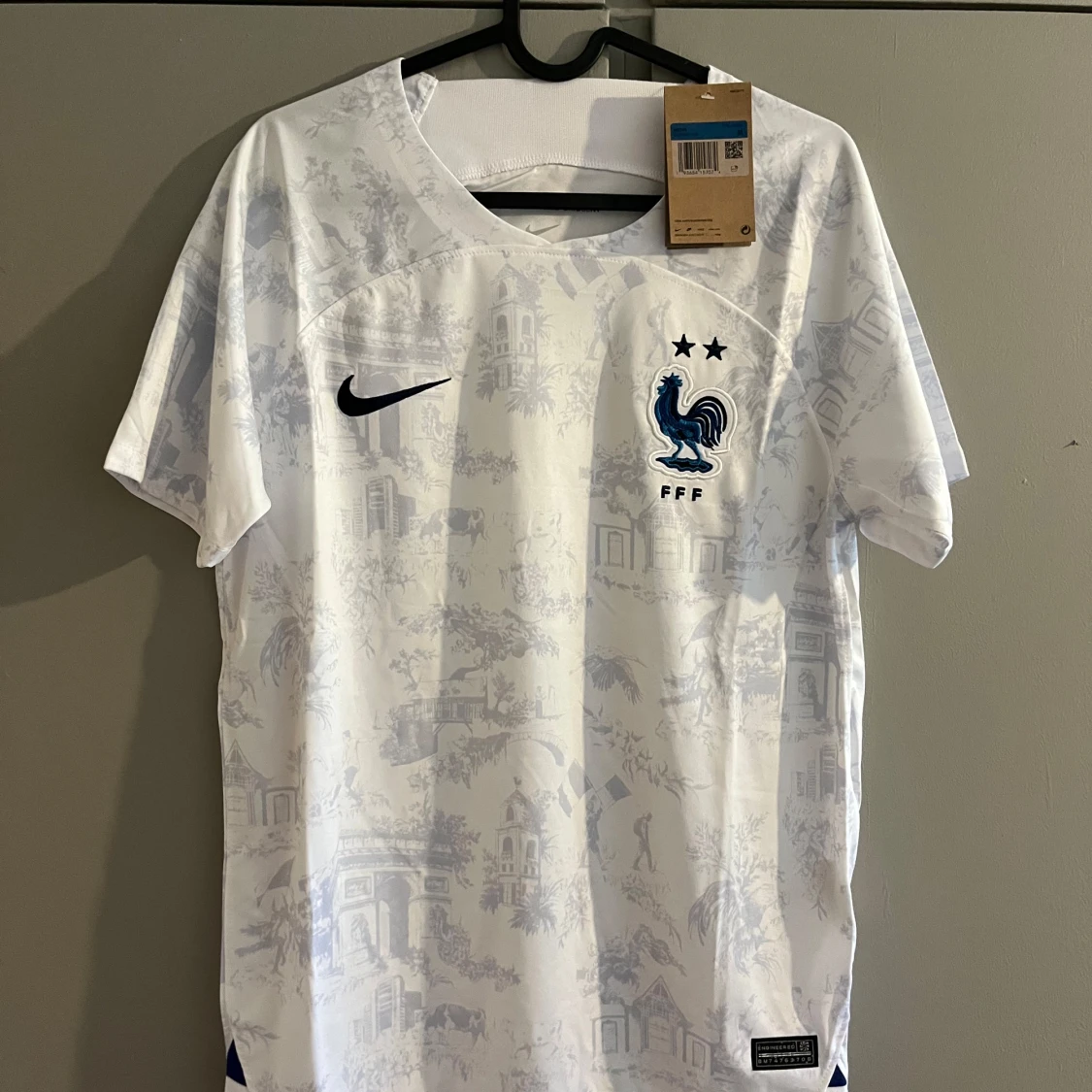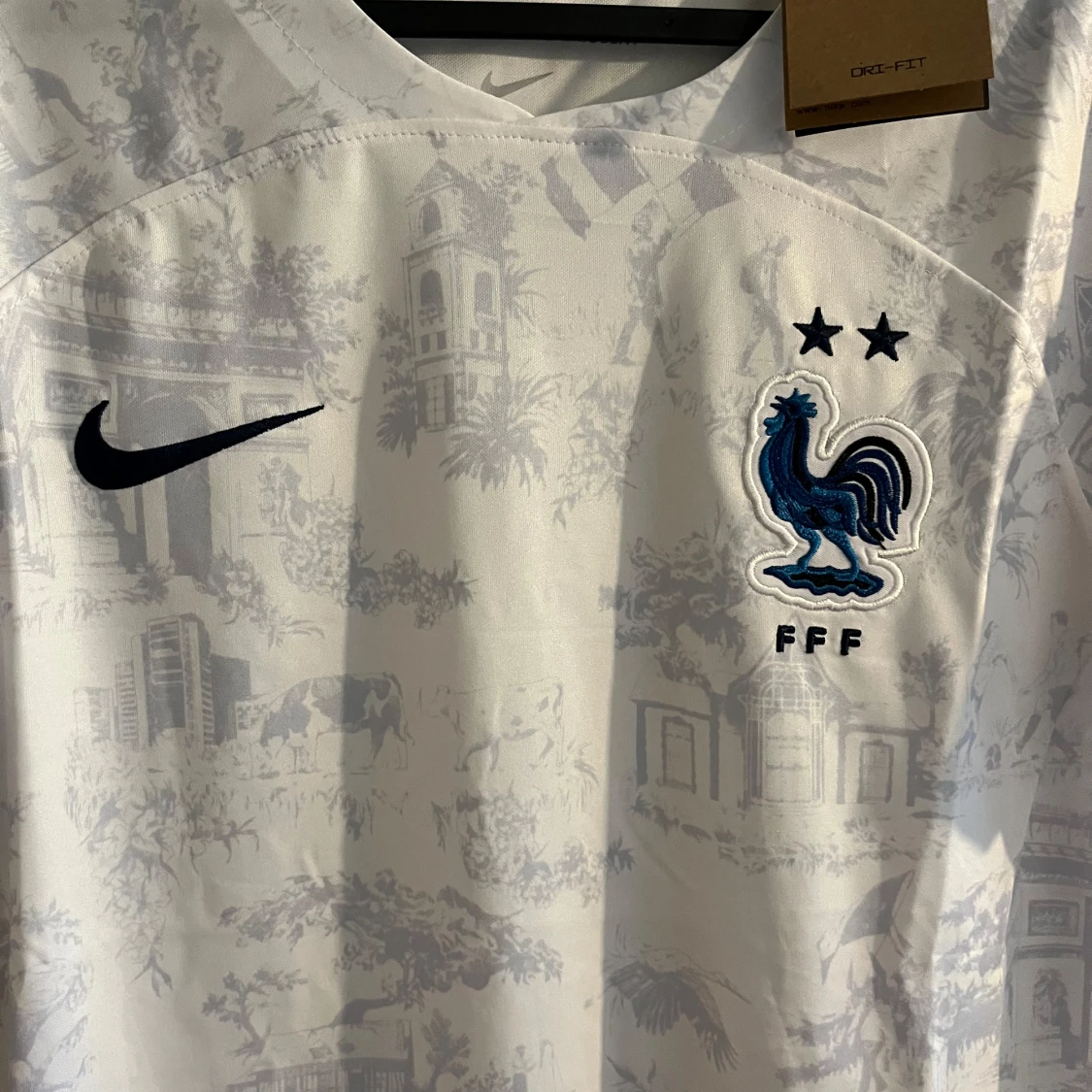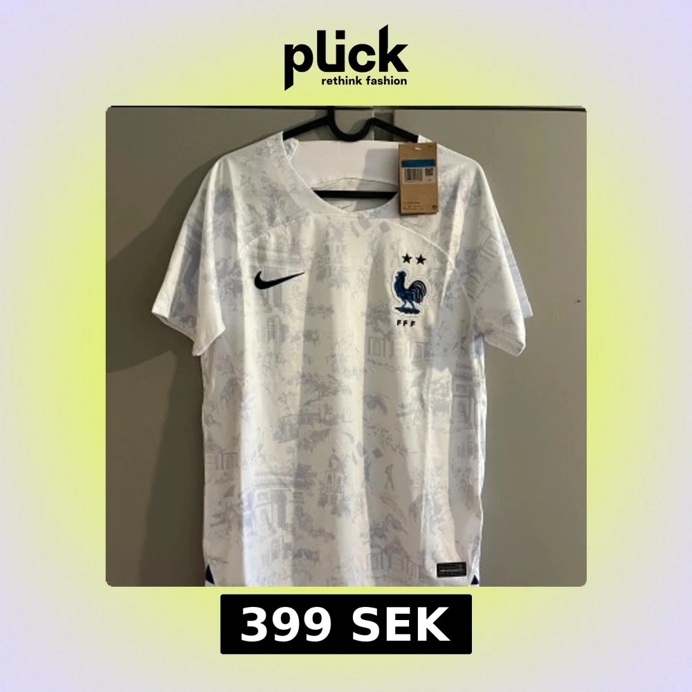 Snygg vit Frankrike fotbollströja från Nike med diskret mönster av franska landmärken och blå tupp-logga med två stjärnor på bröstet. Kortärmad modell i lätt och ventilerande Dri-FIT-material, perfekt för match eller träning.