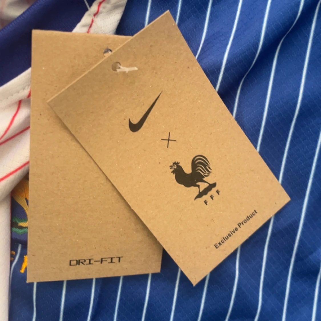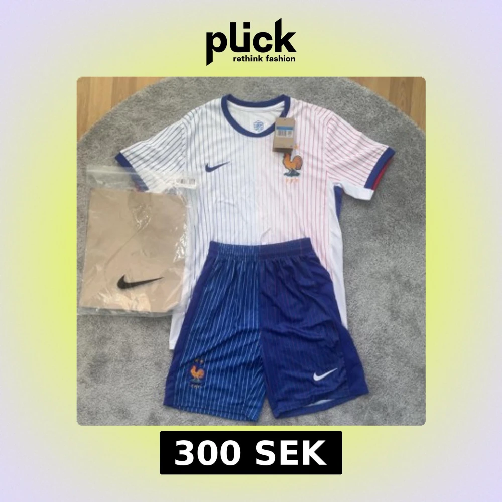 Säljer en matchtröja och shorts från Frankrikes landslag. Tröjan är vit med tunna blå och röda ränder, blå Nike-logga och FFF-märke med tupp. Shortsen är blå med vita och röda ränder samt FFF-logga. Båda i lätt och ventilerande material.