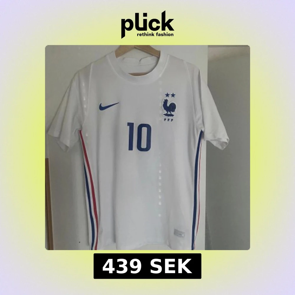 Säljer en officiell Frankrike fotbollströja från Nike med nummer 10 och Mbappé på ryggen. Tröjan är vit med blå detaljer, broderat FFF-emblem och två stjärnor på bröstet. Sidorna har rödblå ränder. Tillverkad i lätt och ventilerande material, perfekt för match eller träning. Kom dm för fler frågor eller bilder. Kan gå ner pris vid snabb affär.
