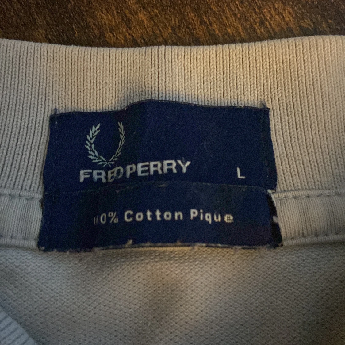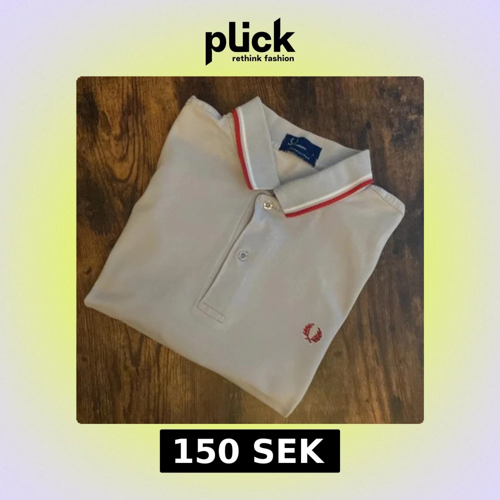 Fred Perry piké i ljusgrått med röda detaljer och broderad logga. Storlek Large. Klassisk twin tipped-modell med ikonisk stil. Har svettmärken men i övrigt fint skick – inga hål eller trasiga sömmar. Perfekt för dig som gillar stilen men vill fynda.