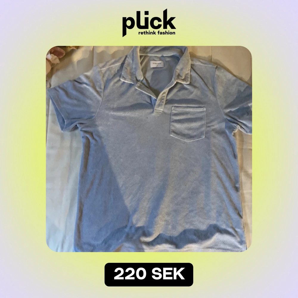 Säljer en ljusblå t-shirt i frotté från Studio Total. Den har en klassisk krage och en bröstficka som ger en avslappnad look. Perfekt för sommarens varma dagar. Passar både till stranden och vardags. Köparen står för frakt