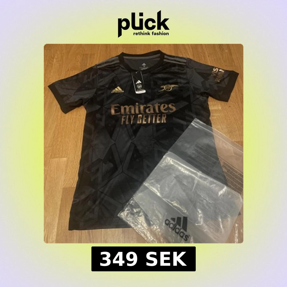 Snygg svart Arsenal fotbollströja från Adidas i storlek S. Tröjan har korta ärmar, guldiga detaljer och loggor, samt ett geometriskt mönster över hela tyget. Materialet är lätt och andas, perfekt för match eller träning. Emirates Fly Better tryck på bröstet.
