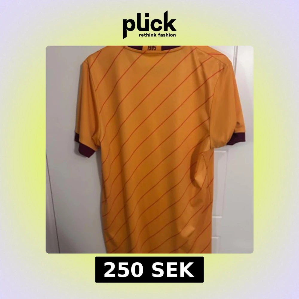 Säljer en gul fotbollströja med vinröda diagonala ränder och detaljer. Tröjan har korta ärmar och en rund halsringning. Perfekt för fotbollsfans som vill visa sitt stöd med stil! 🟡🔴