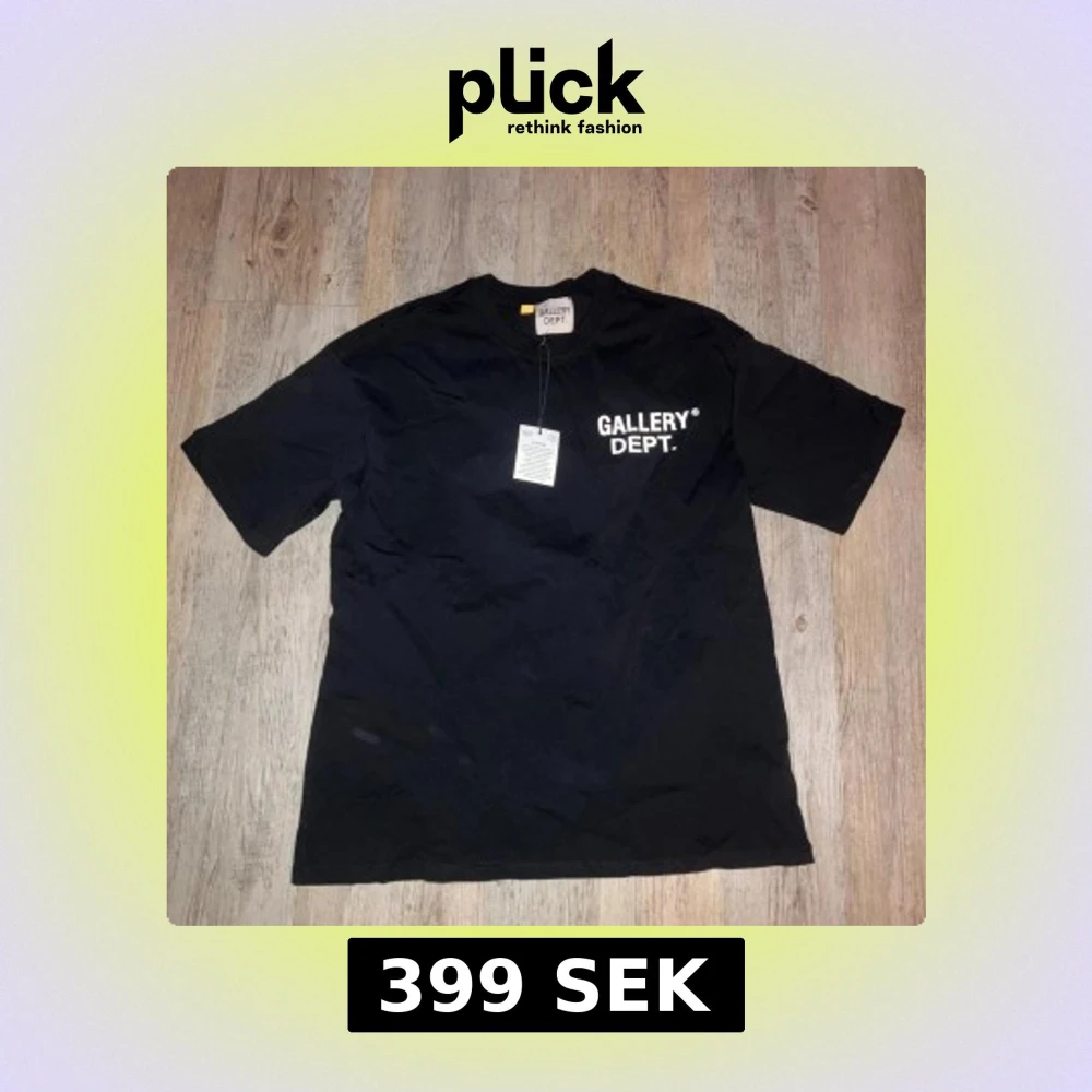 Svart t-shirt från Gallery Dept. med vit tryckt logga på bröstet och stor text på ryggen med 'GALLERY DEPT. HOLLYWOOD, CA.'. Klassisk rund hals och korta ärmar. Materialet är mjuk bomull som känns skön mot huden. Perfekt för dig som gillar streetwear och tydliga prints. Storlek S men sitter som M/L