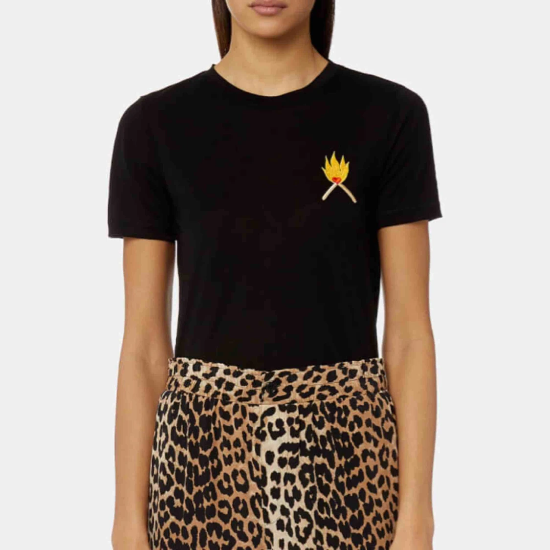 Äkta Oanvänd Ganni Tshirt med gullig broderi av tändstickor och eldflammor! 🔥 Säljer pga att jag köpte fel storlek. 📨 Frakt är inräknat i priset! Kan även mötas upp i Lund/Malmö! Hör av er om ni är intresserade!
