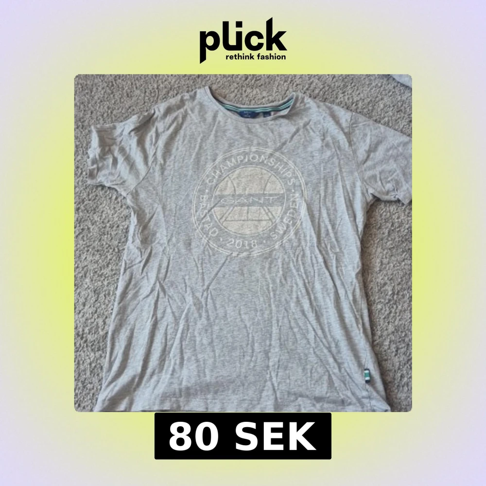 Säljer en grå t-shirt från Gant med tryck 'Championships Båstad Sweden 2018' på framsidan. T-shirten är kortärmad och har en rund halsringning. Perfekt för en avslappnad stil. Storleken är barn 176, 16 år