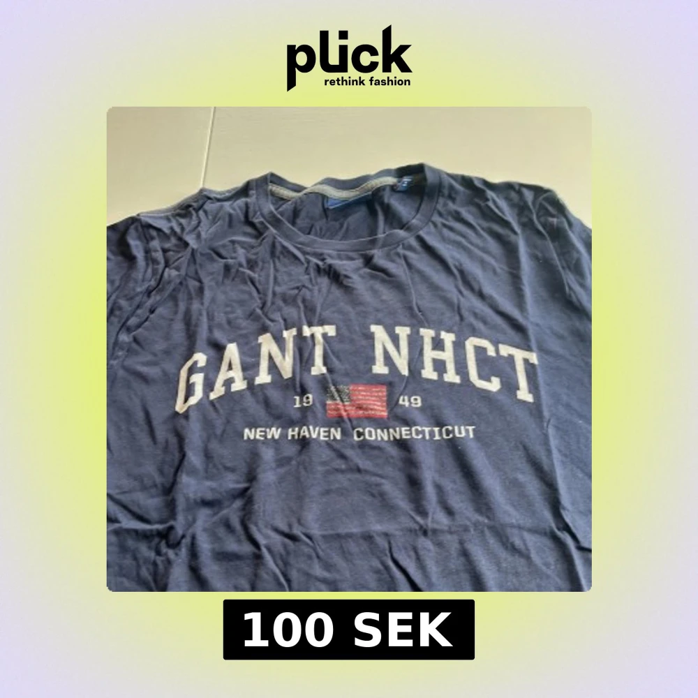 Säljer en blå t-shirt från GANT med tryck 'GANT NHCT' och en amerikansk flagga. Texten 'New Haven Connecticut' finns också på framsidan. Perfekt för en avslappnad stil.