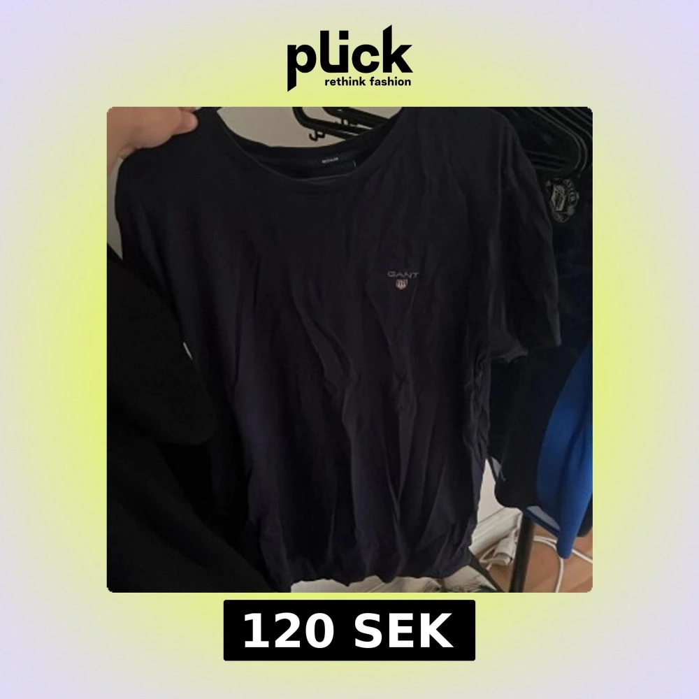 Säljer en stilren mörkblå t-shirt från GANT i storlek M. T-shirten har klassisk rund hals, korta ärmar och en liten GANT-logga broderad på bröstet. Materialet är mjuk bomull och passformen är regular. Perfekt för dig som gillar enkla och snygga plagg.