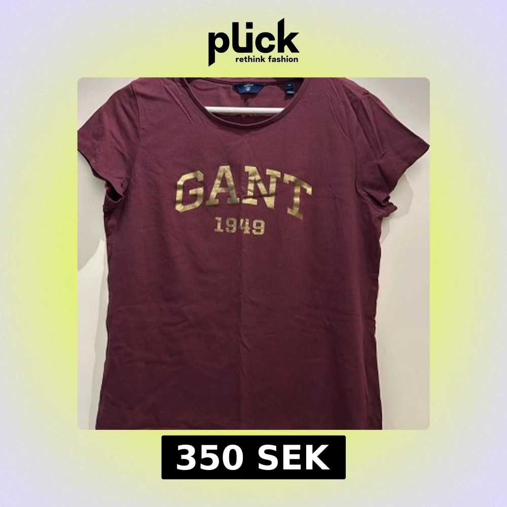 Säljer en snygg vinröd t-shirt från GANT med guldtryck av märkesnamnet och årtalet 1949 på framsidan. T-shirten har en rund halsringning och korta ärmar. Perfekt för en avslappnad stil.