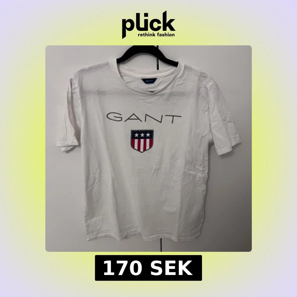 Säljer en klassisk vit t-shirt från GANT med tryck av logotyp och ett sköldemblem i rött, vitt och blått. Perfekt för en stilren och avslappnad look. Storlek S passar M