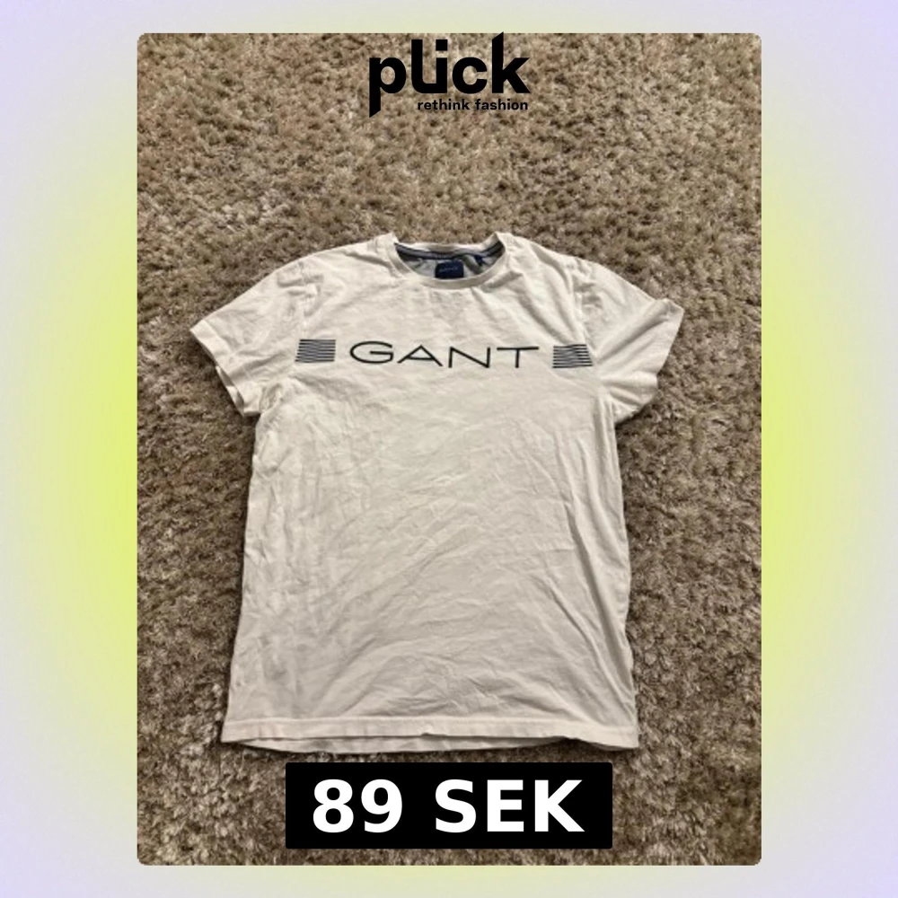 Snygg vit t-shirt från GANT med klassisk logga i svart framtill och stilrena ränder på sidorna av trycket i storlek S.T-shirten har rund halsringning och är tillverkad i mjuk bomull. Perfekt för en clean och enkel stil. Har du några funderingar så skriv gärna🙏