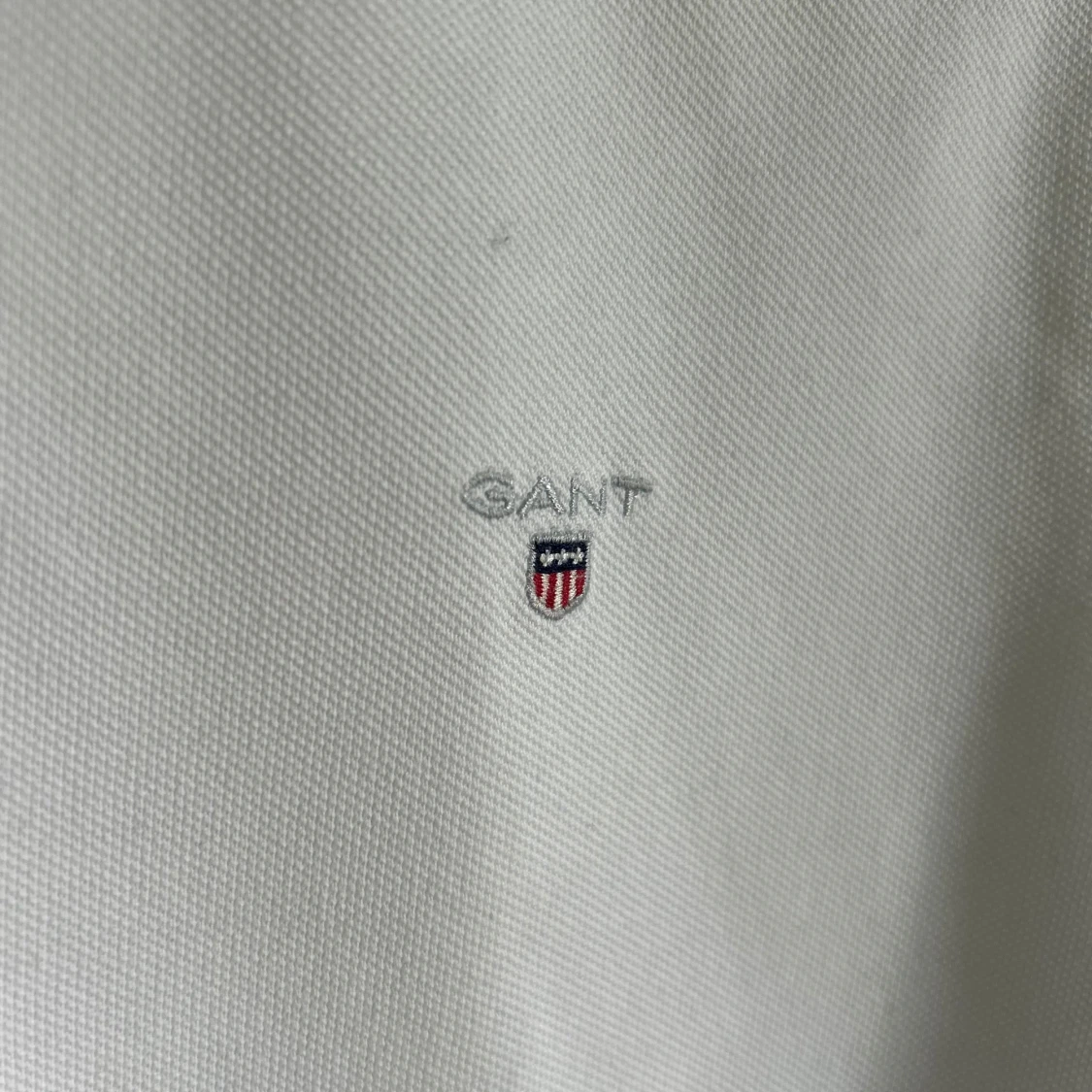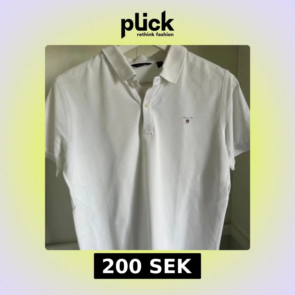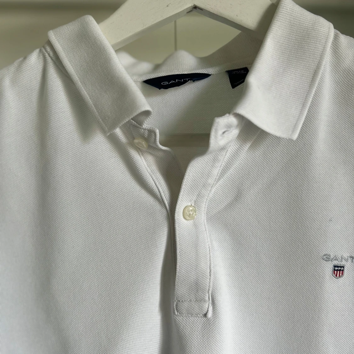 Klassisk vit pikétröja från GANT med broderad logga på bröstet. Tröjan har krage, korta ärmar och knäppning med två knappar framtill. Tillverkad i bomull för en skön och luftig känsla. Perfekt för en clean och stilren look. Perfekt till dig som vill börja resella eller ha märkeskläder till feta priser