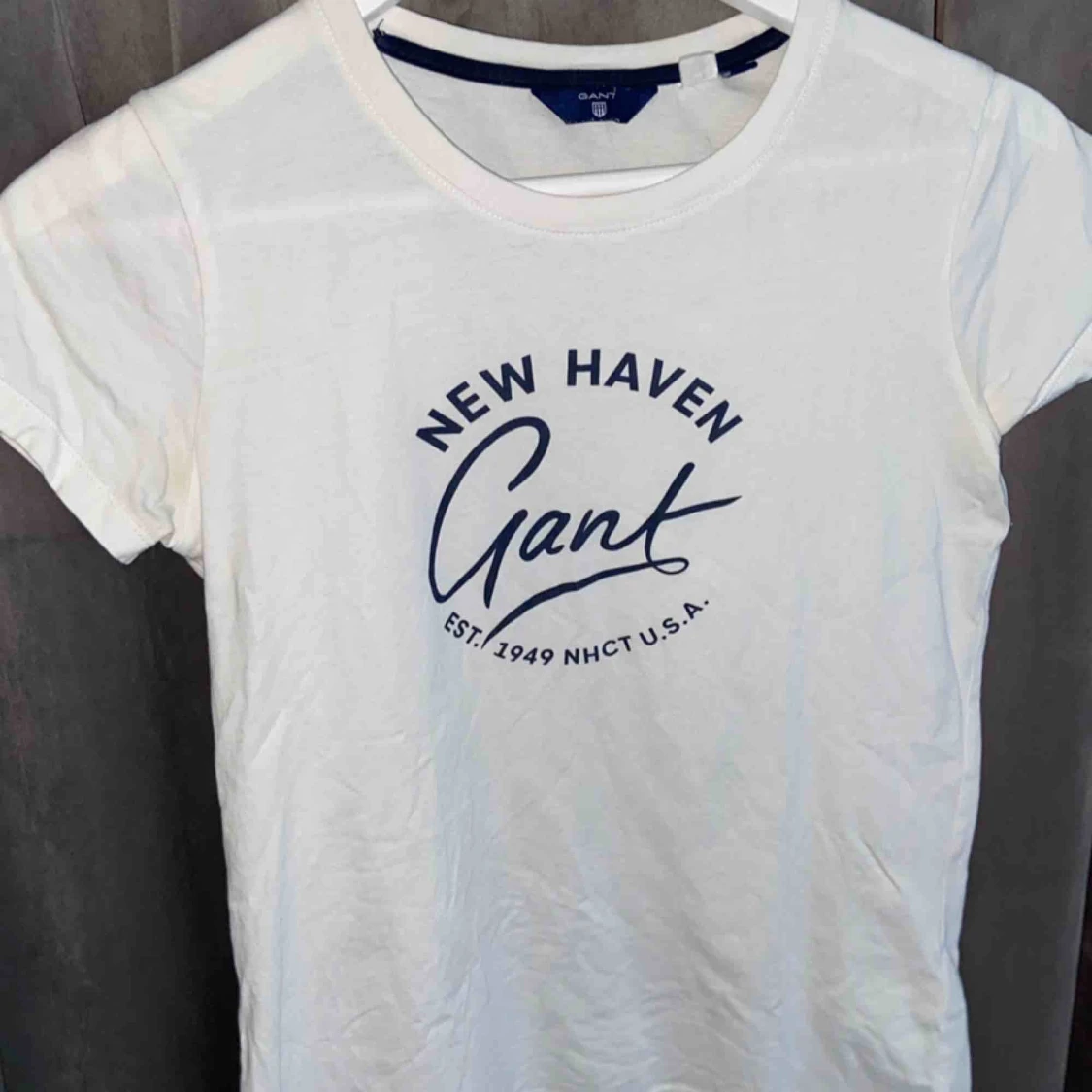 En vit t-shirt med blått tryck på bröstet/magen. Den är använd flera gånger och är suuperskön. Fungerar även för dig med storlek small. Nypris 399kr