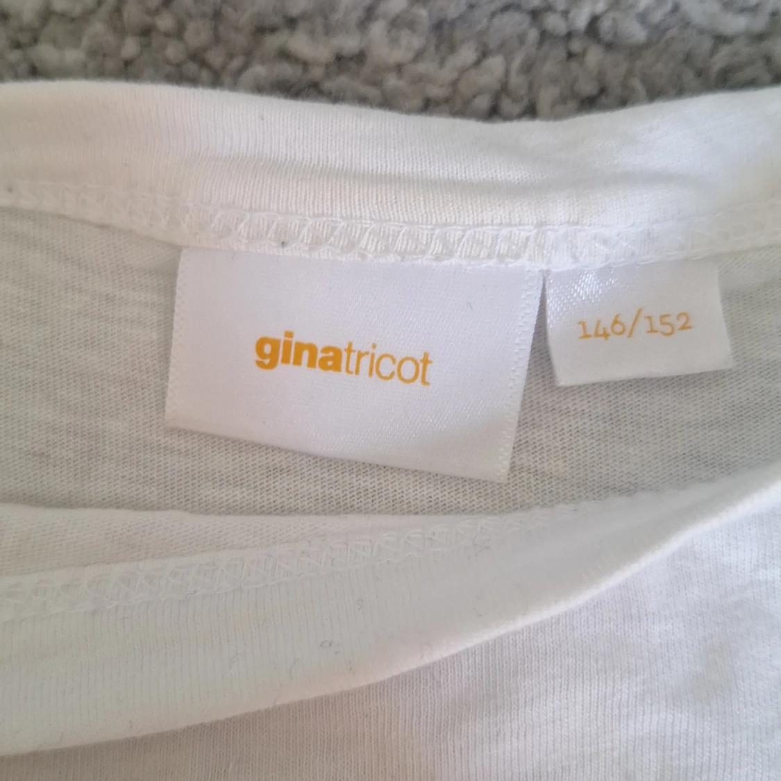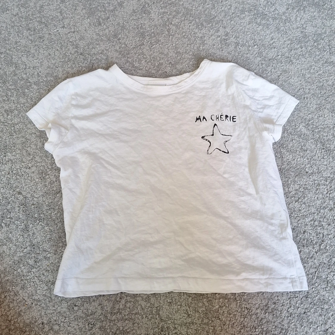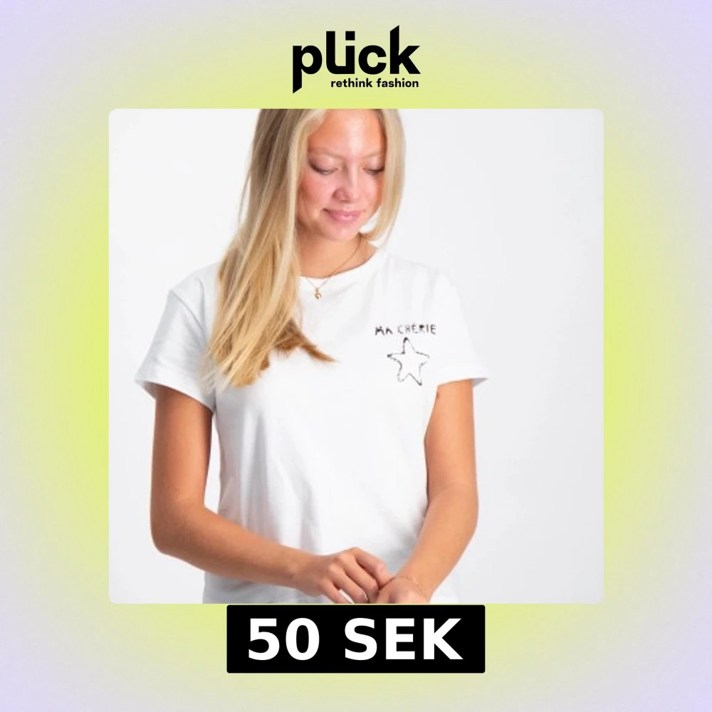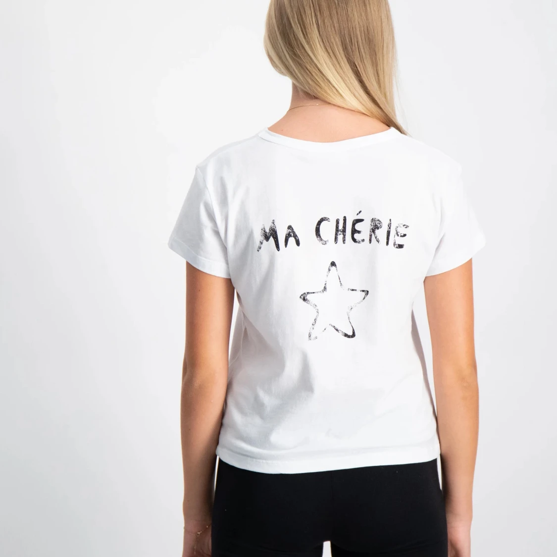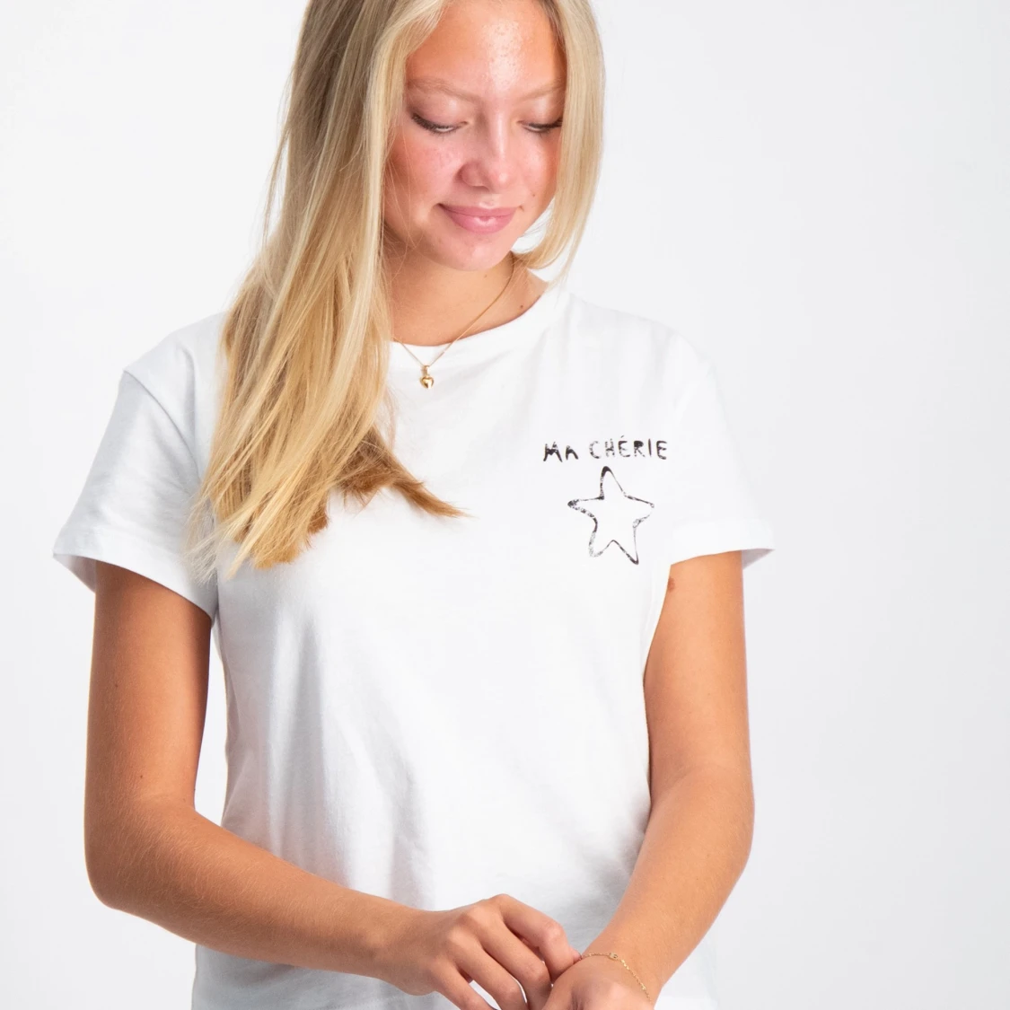 Vit t-shirt från Gina Tricot med svart texten 'MA CHÉRIE' och en stjärna tryckt både fram och bak. Klassisk rund hals och korta ärmar. Skön passform och tillverkad i mjuk bomull. Säljs för att den är för liten!