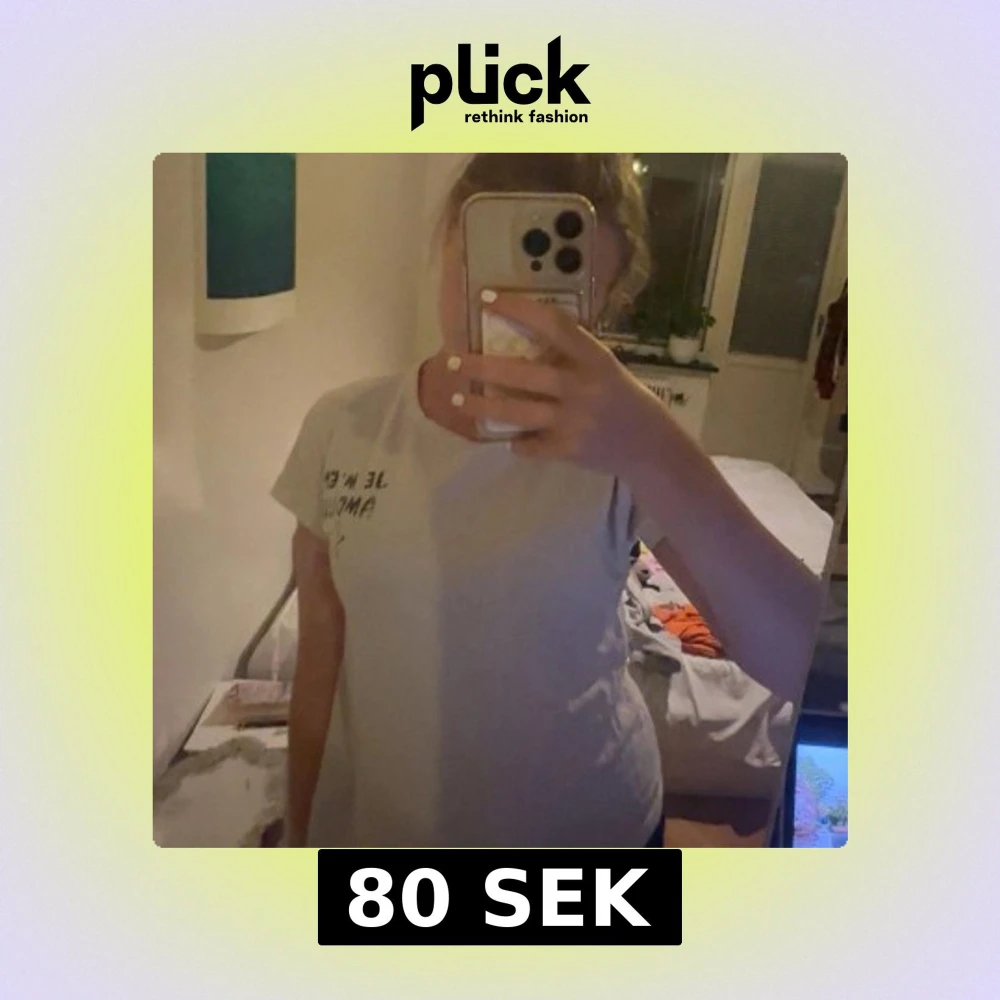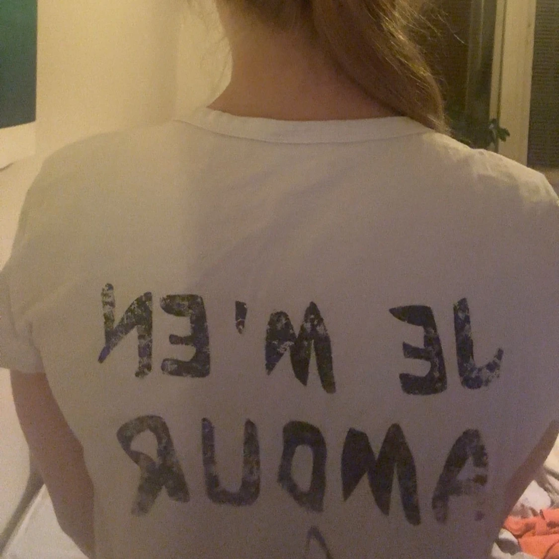 Säljer en vit t-shirt med svart tryck på bröstet där det står 'Je m'en Amour' och en liten stjärna under texten. T-shirten har rund hals och korta ärmar, klassisk passform och är gjord i mjukt bomullstyg. Perfekt för dig som gillar enkla men snygga statement-plagg. passar xs