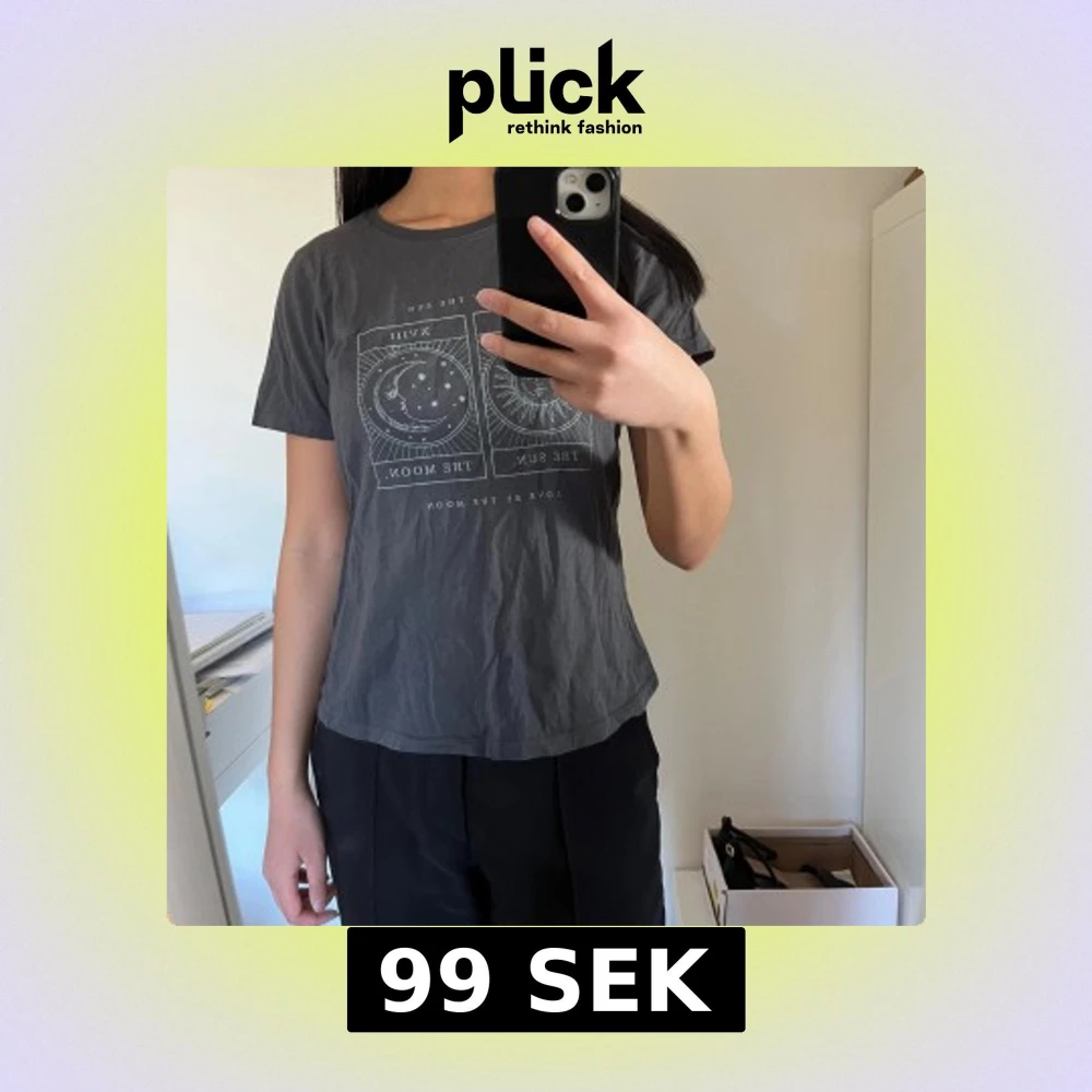 Snygg grå t-shirt med tryck av solen och månen i vitt. Perfekt för en avslappnad stil. Rund hals och kortärmad design.