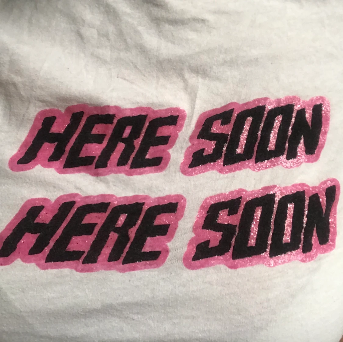 Snygg t-shirt med trycket ”here soon” (x2). Passar bra på mig som oftast har S/M men sitter tajt då den är XS