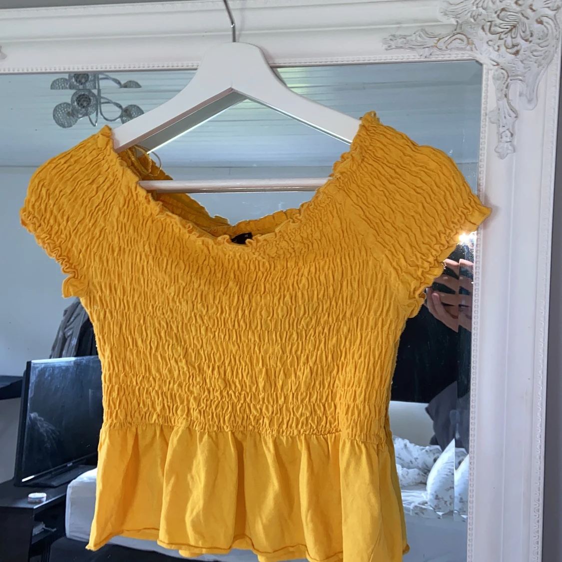 Gul tröja i off shoulder modell, storlek XS