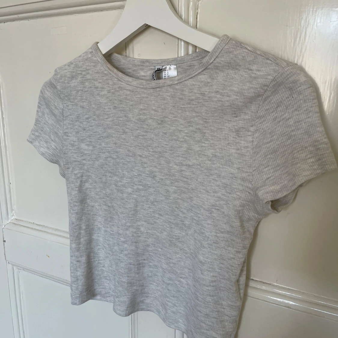 Ljusgrå croppad t-shirt från Gina Tricot med ribbad struktur. T-shirten har rund hals och korta ärmar.