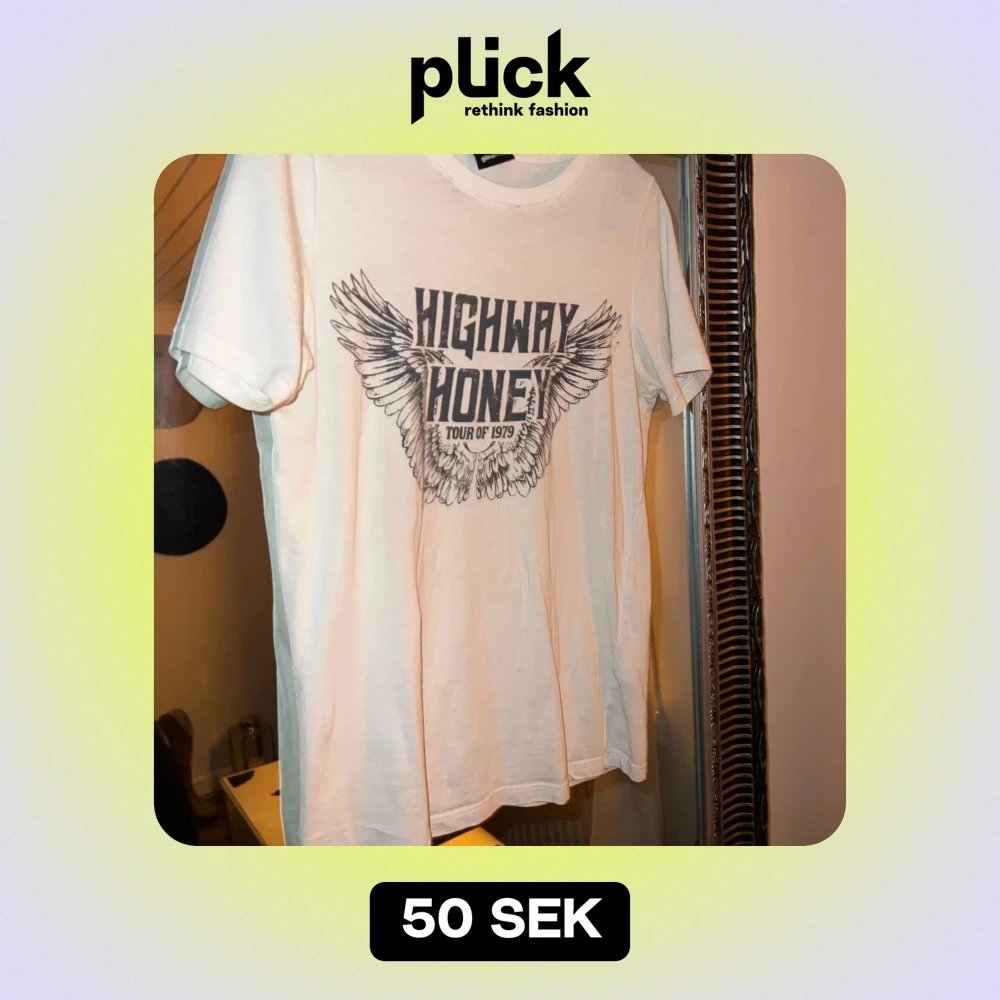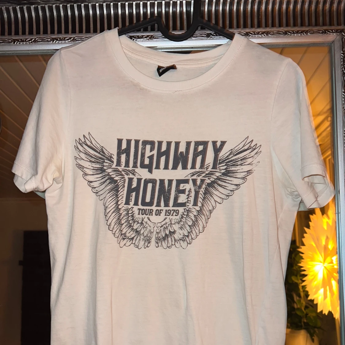 Säljer en vit t-shirt med coolt tryck 'Highway Honey Tour of 1979' och vingar. Perfekt för en avslappnad stil eller konsert. T-shirten är kortärmad och i bra skick. Passar perfekt till jeans eller shorts!
