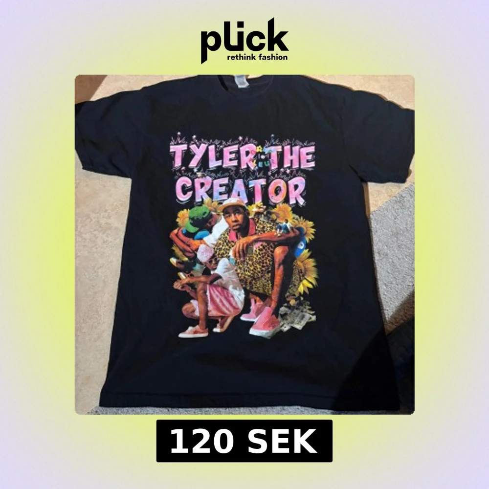 Svart T-shirt med tryck av Tyler, the Creator och texten 'Flower Boy'. Framsidan har en design med blommor och en lista av låttitlar på baksidan.