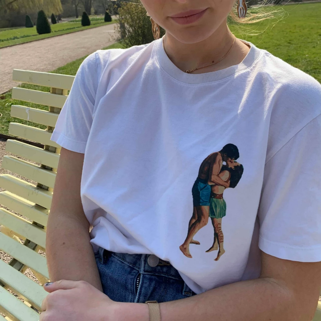 Vintage vit t-shirt men nytryckt design av högsta kvalitet! SAMSARA köper in secondhand kläder som inte blir sålda och revitaliserar dem med unika och högkvalitativa tryck. Varje plagg sparar cirka 2400L vatten och 1,4 kg co2! Modellen är 162cm!