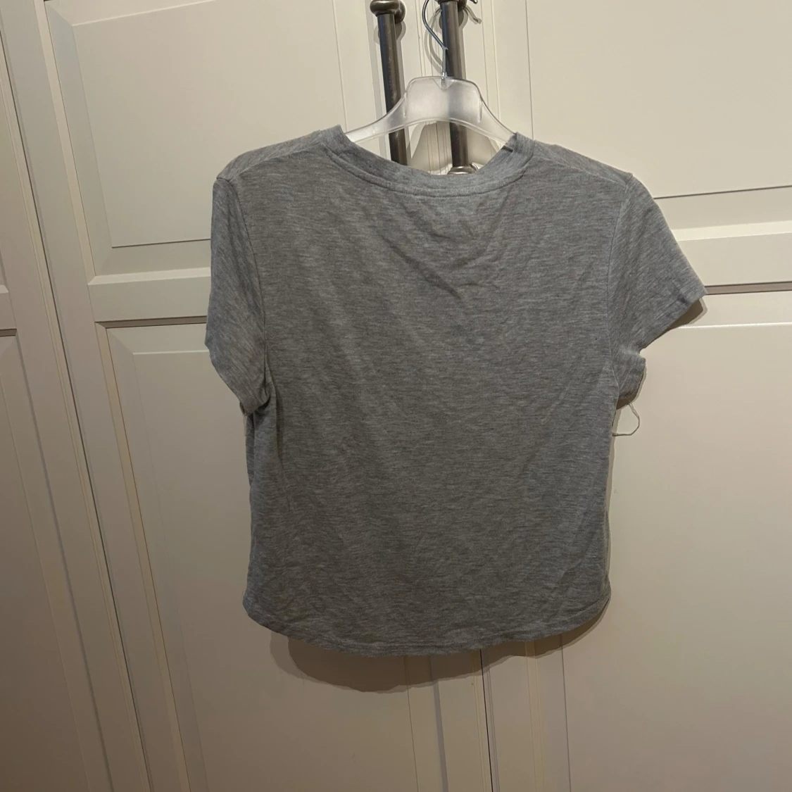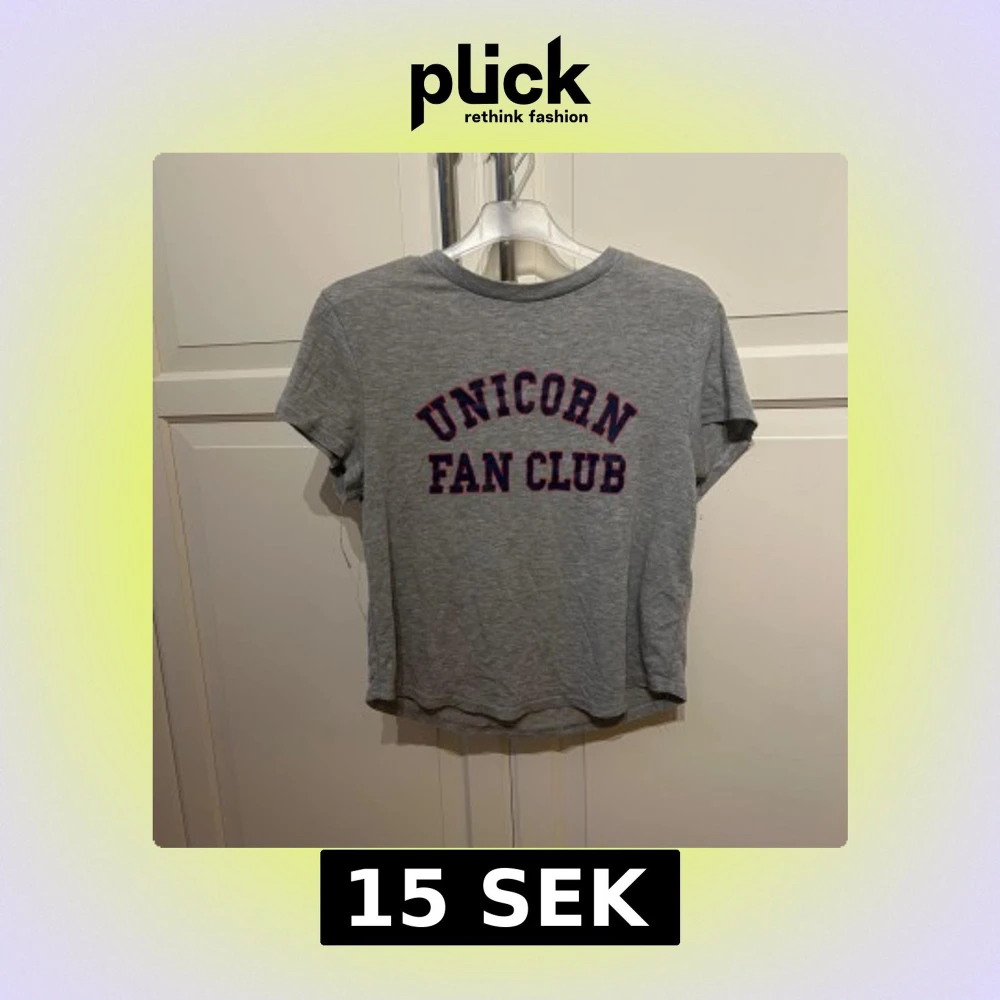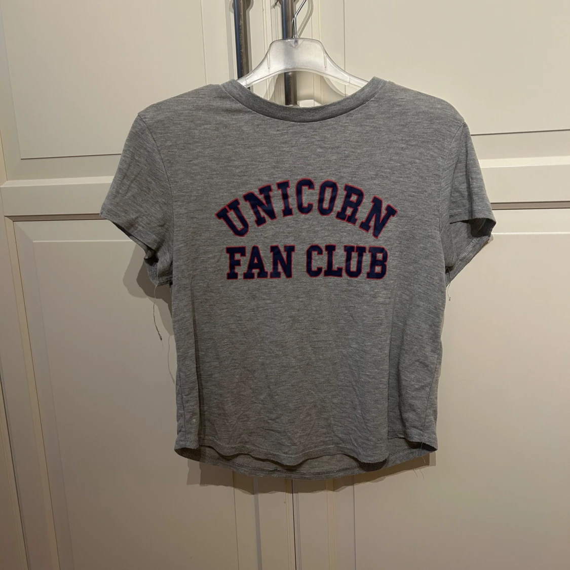Grå croppad t-shirt från H&M med texten 'UNICORN FAN CLUB' i blå och rött på bröstet. T-shirten har korta ärmar och rund halsringning. I strl S