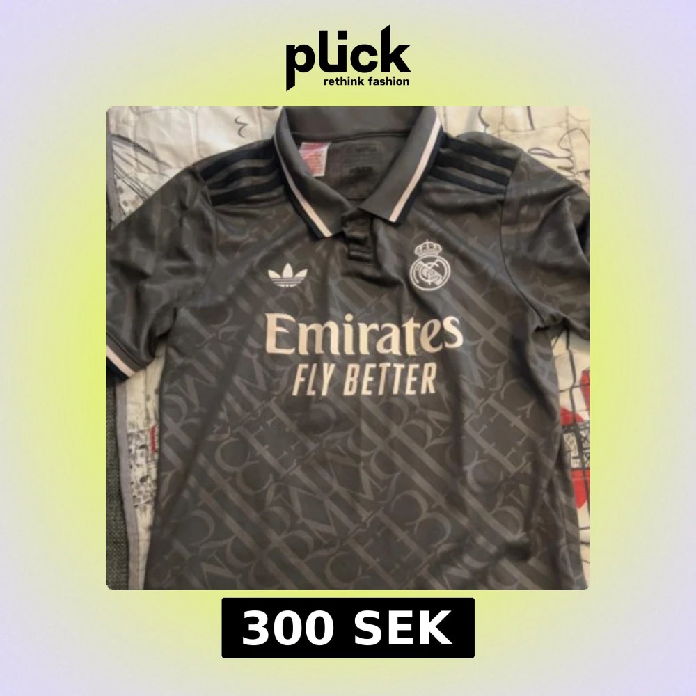 Säljer en grå fotbollströja från Adidas med Real Madrid-logga och 'Emirates Fly Better' tryckt på framsidan. Tröjan har korta ärmar och en klassisk krage med vita detaljer. Perfekt för fotbollsfans!
