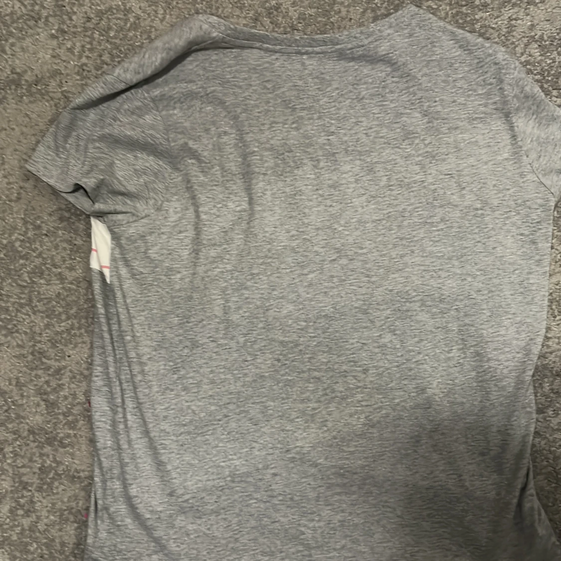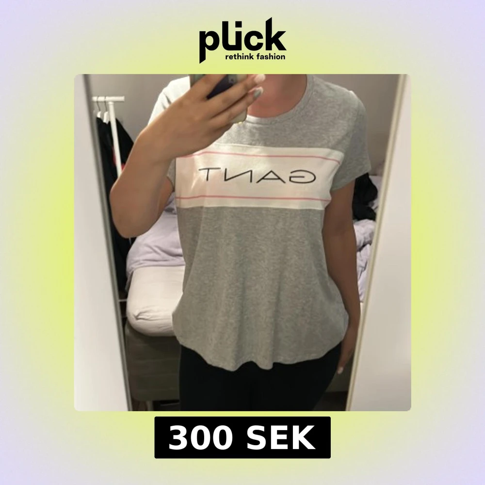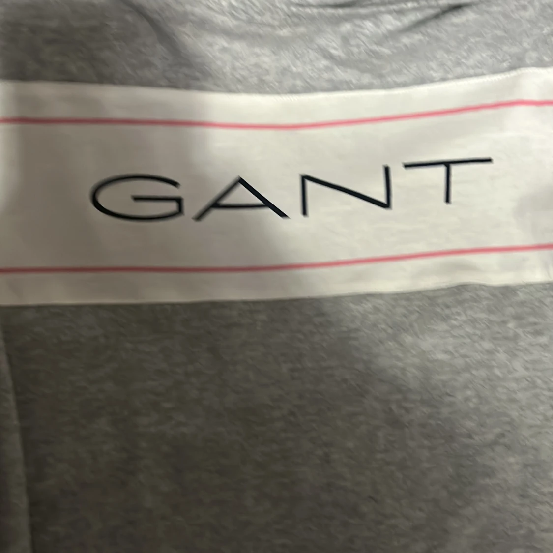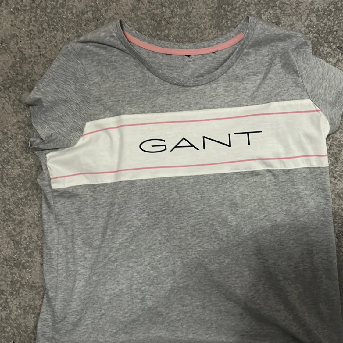 Snygg grå t-shirt från GANT med klassisk logga tryckt över bröstet i svart. T-shirten har korta ärmar, rund halsringning och en vit panel med rosa linjer framtill. Skön och mjuk i bomull, perfekt till jeans eller shorts.