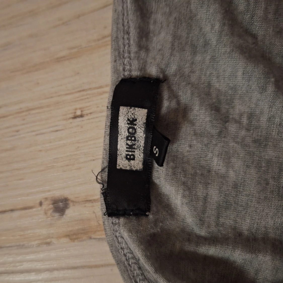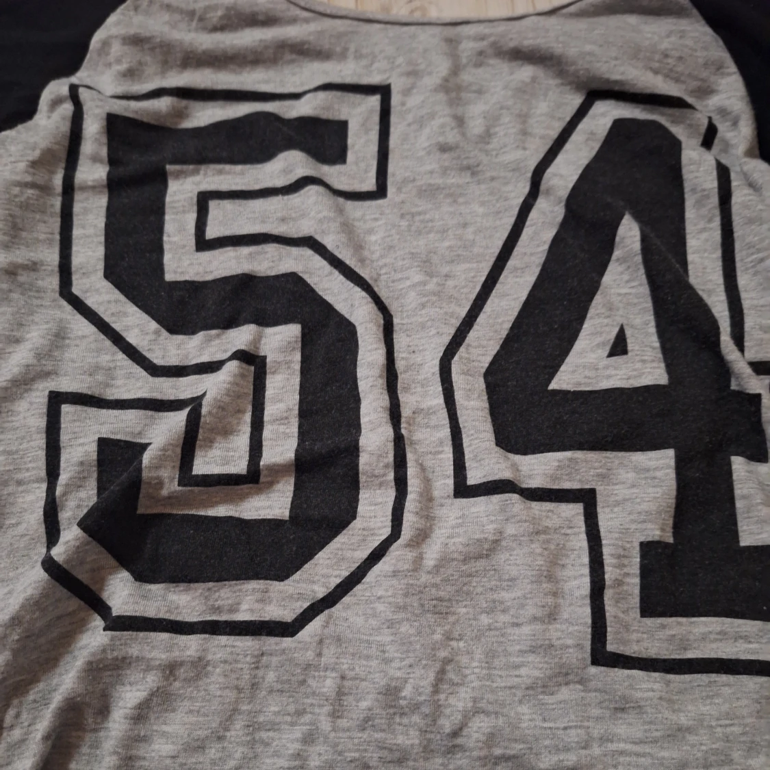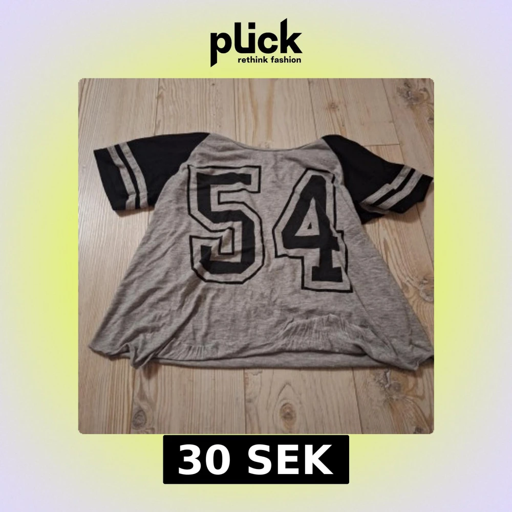 Snygg grå t-shirt från Bik Bok med svarta ärmar och stora siffran 54 tryckt på framsidan. Ärmarna har coola ränder och tröjan lutar mer mot en magtröja än en vanlig tröja. Perfekt för en sportig och chill stil.