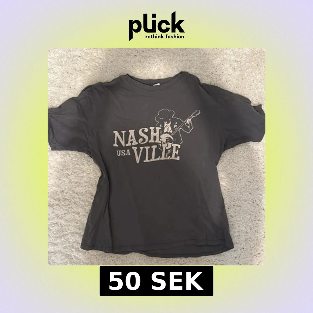 Cool grå t-shirt från H&M Divided med Nashville USA-tryck och en siluett av en gitarrspelande cowboy. Klassisk passform, rund hals och korta ärmar. Perfekt för dig som gillar musik och streetstyle. Har ett litet hål, syns på sista bilden. Storlek XS men oversized.