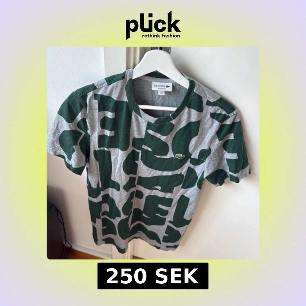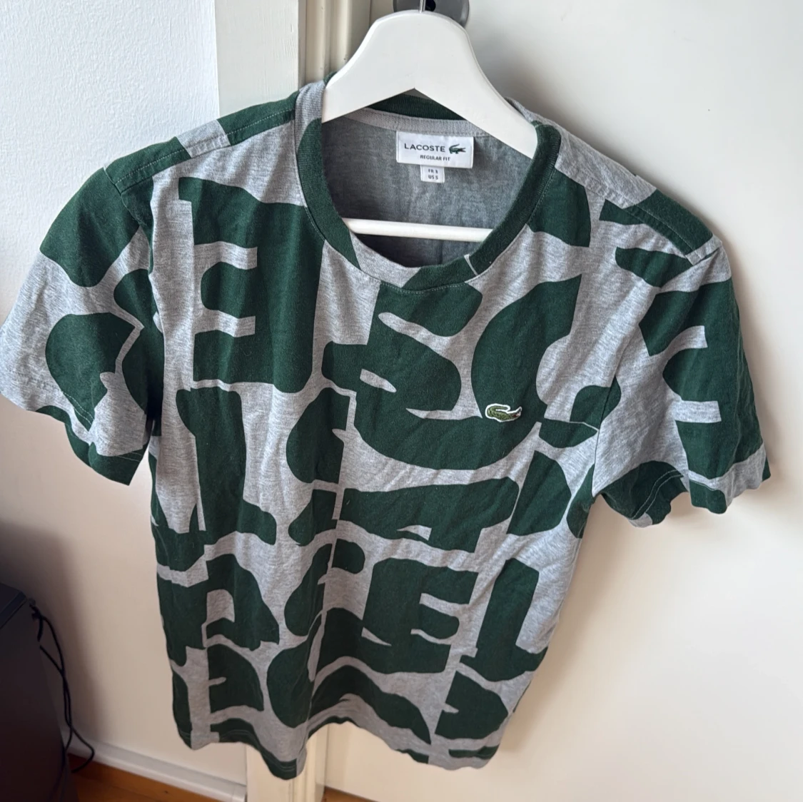 Säljer en grå och grön t-shirt från Lacoste med ett unikt mönster. T-shirten har korta ärmar och är perfekt för en avslappnad stil. Den ikoniska Lacoste-loggan syns på bröstet. Passar bra till jeans eller shorts.