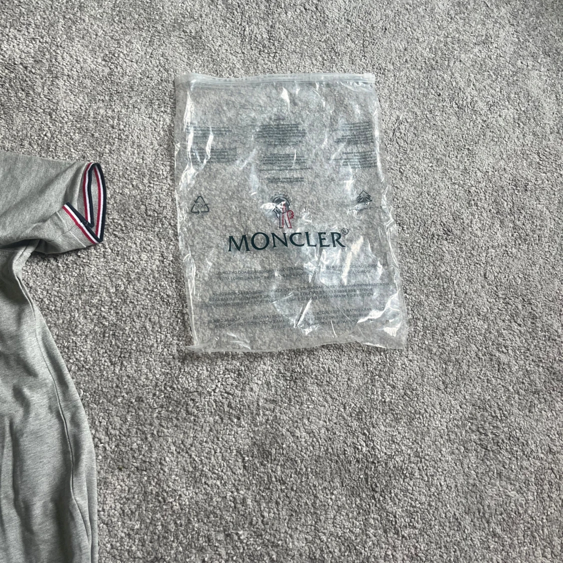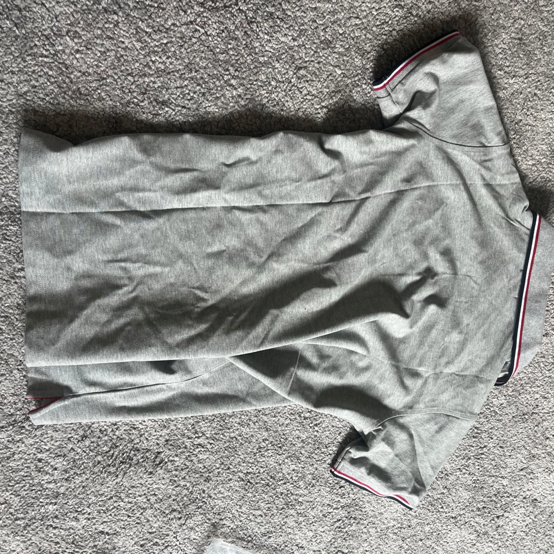 Snygg grå piké t-shirt från Moncler med klassisk krage och knappar. Tunn röd, vit och blå rand på krage och ärmslut. Moncler-logga broderad på bröstet. Perfekt för en stilren och sportig look. Skriv vid frågor!