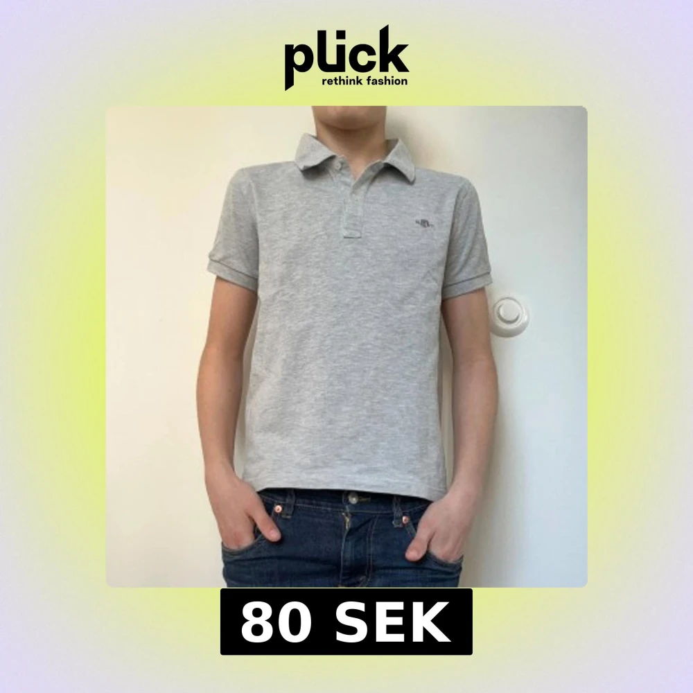Säljer en snygg grå pikétröja från Gant med klassisk krage och korta ärmar. Tröjan har en broderad logotyp på bröstet. Modellen på bilden är 163cm