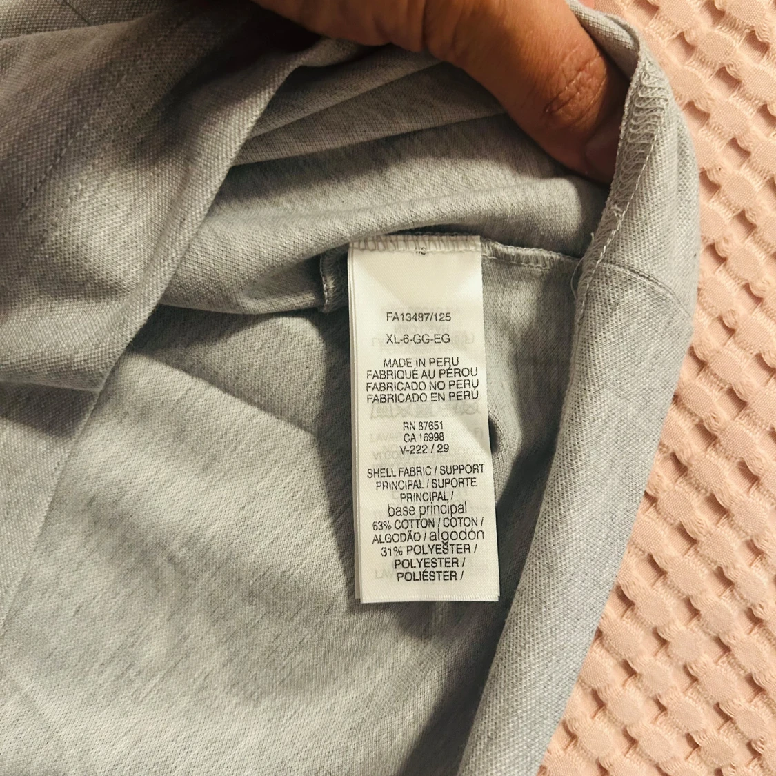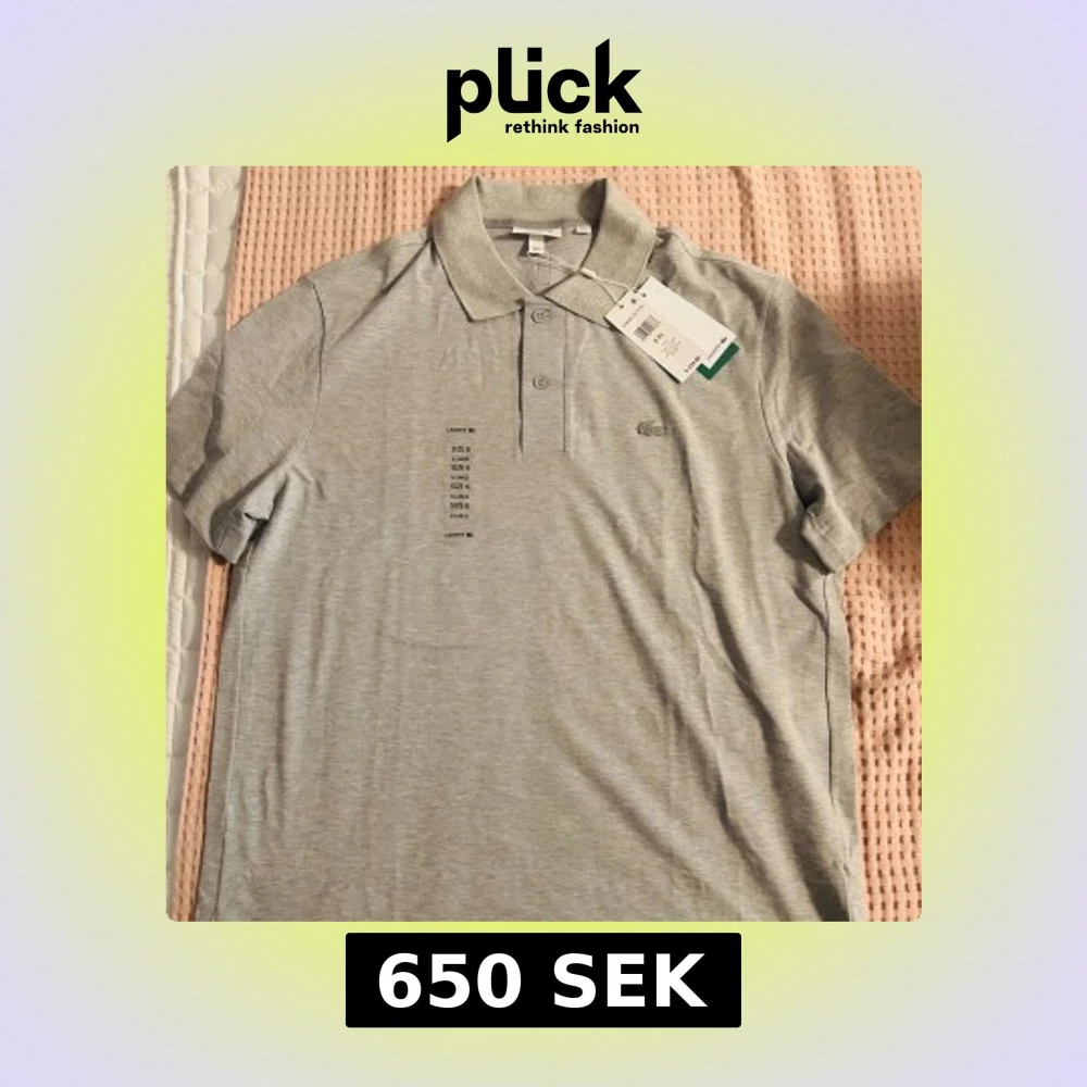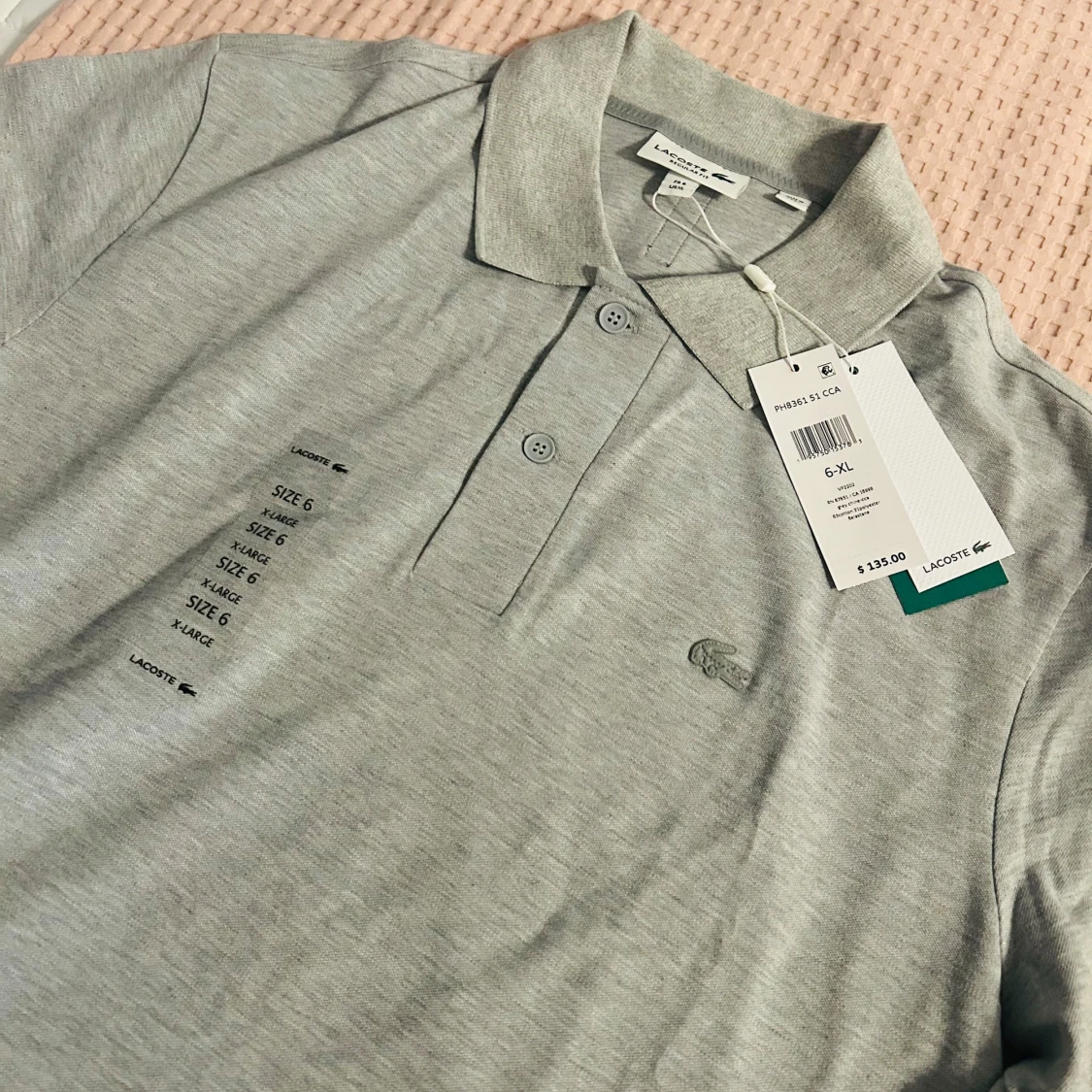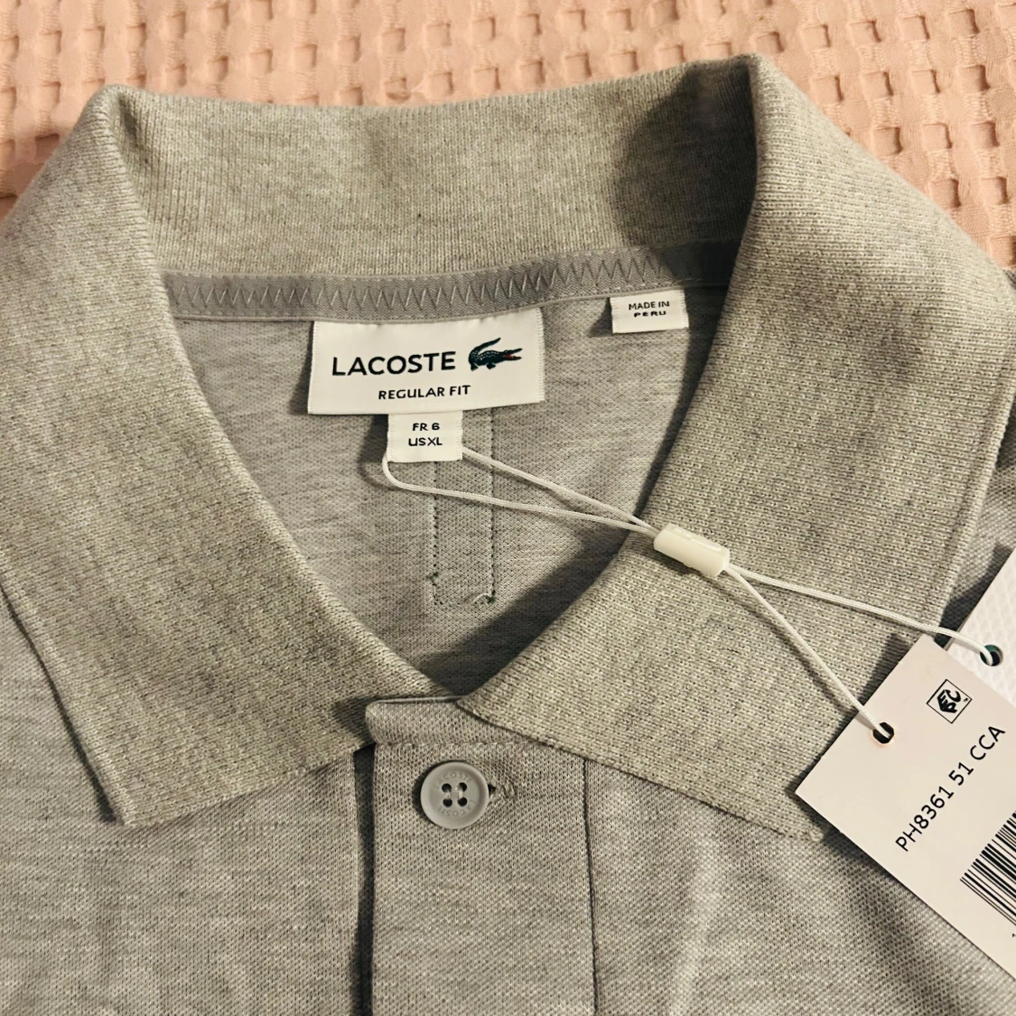 Snygg grå pikétröja från Lacoste i storlek XL. Klassisk krage, knappslå med två knappar och den ikoniska krokodilloggan på bröstet. Tillverkad i en mjuk mix av bomull och polyester för skön passform och stilren look.