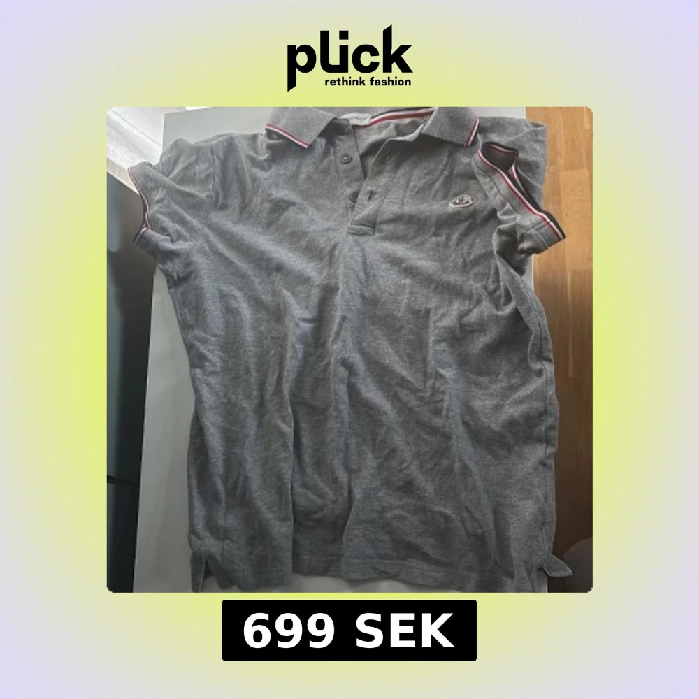 Snygg grå pikétröja från Moncler med klassisk krage och knäppning framtill. Tröjan har korta ärmar med röd och vit randig detalj på krage och ärmslut samt Moncler-logga på bröstet. Perfekt för en stilren och sportig look.