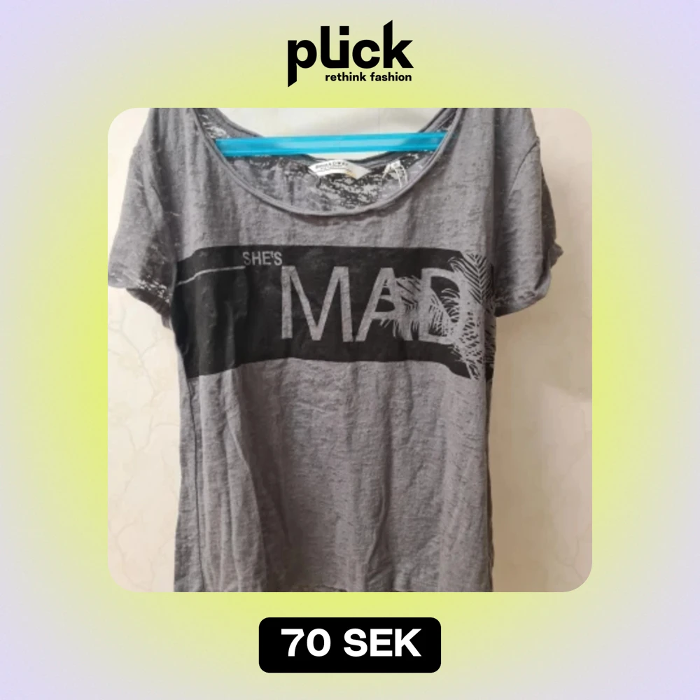 Säljer en cool grå t-shirt med texten 'SHE'S MAD' tryckt i svart på framsidan. T-shirten har en avslappnad passform och korta ärmar, perfekt för en casual look. Materialet känns mjukt och bekvämt.
