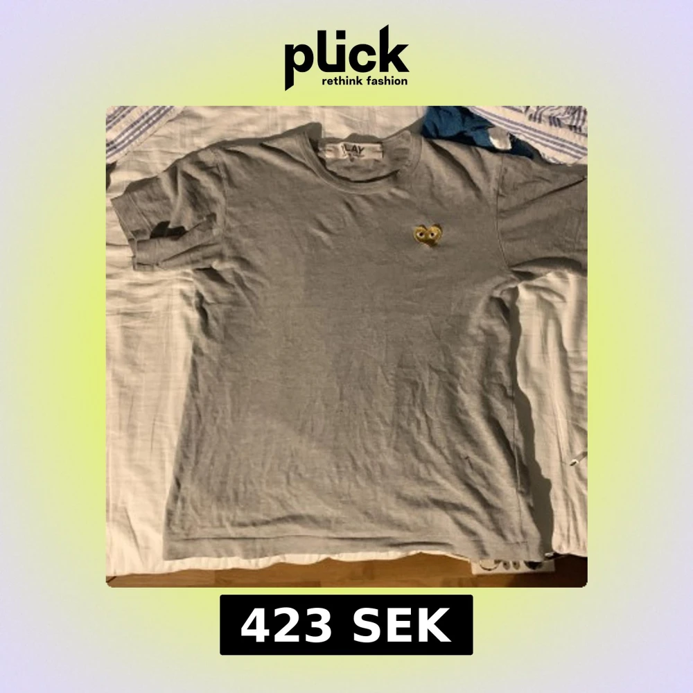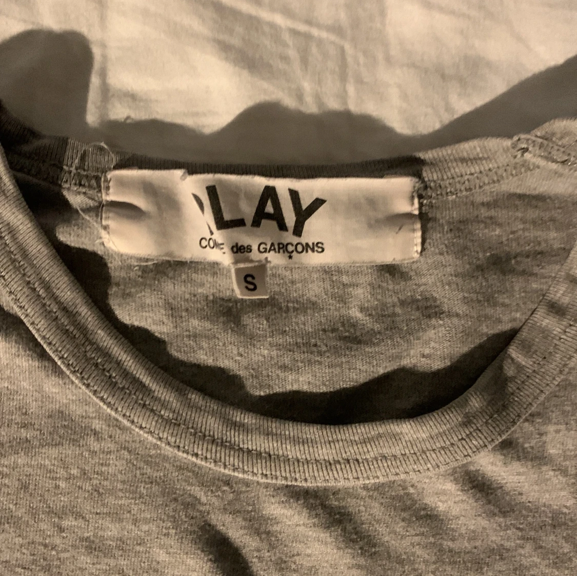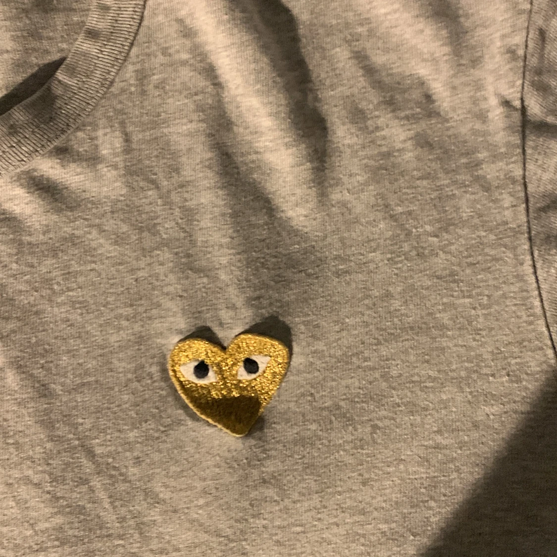 Grå t-shirt från Comme des Garçons Play med klassisk rund hals och korta ärmar. På bröstet sitter det ikoniska hjärtat i guld med ögon, broderat. T-shirten är i mjuk bomull och har en clean, stilren look som passar perfekt till jeans eller shorts.