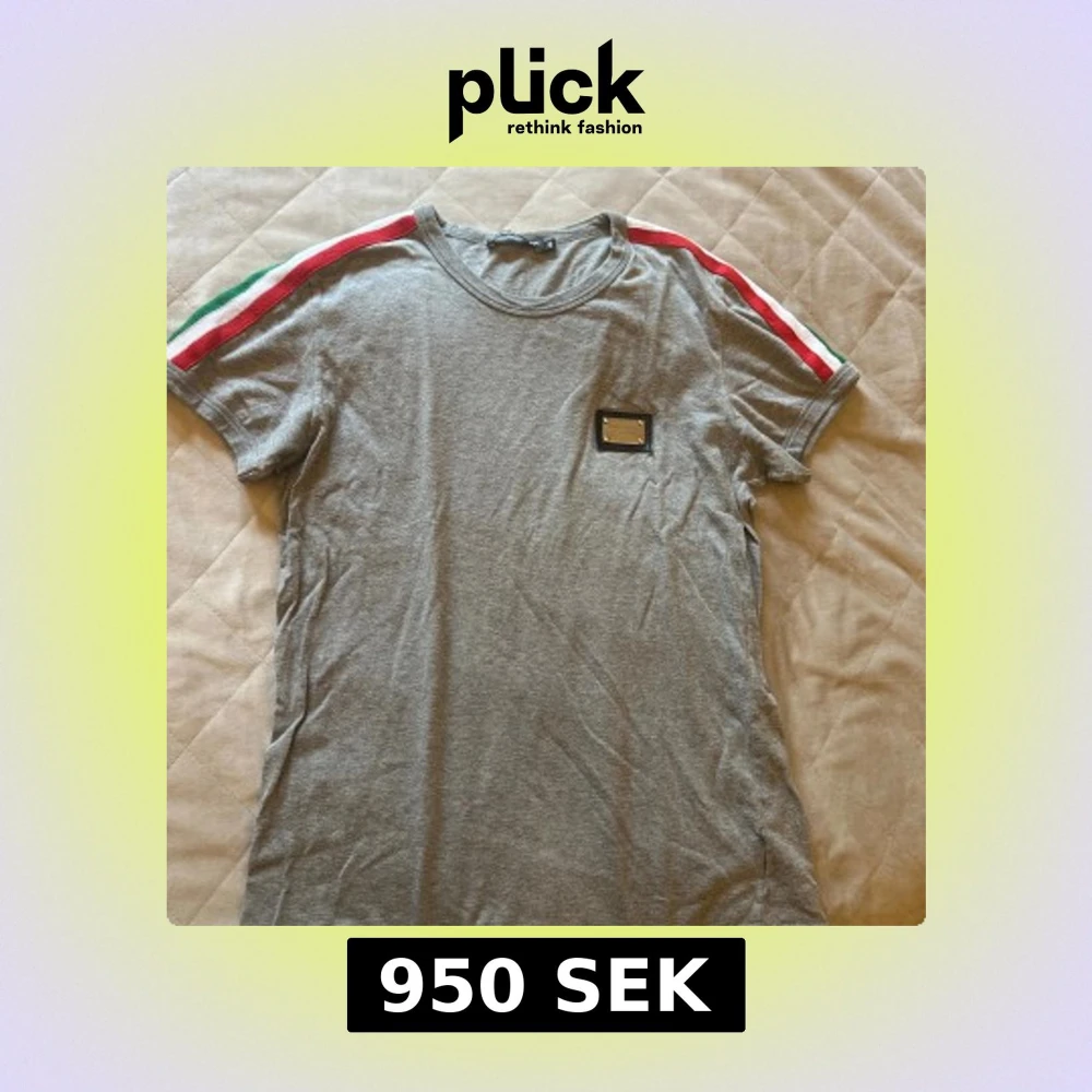 Grå t-shirt från Dolce & Gabbana med korta ärmar och coola ränder i grönt, vitt och rött längs axlarna. Metallbricka med logga på bröstet ger en exklusiv vibe. Skön passform och klassisk rund halsringning. Perfekt för dig som gillar stilrena men ändå unika plagg. Vintage piece som är super rare och köpt i Italien ca 2004