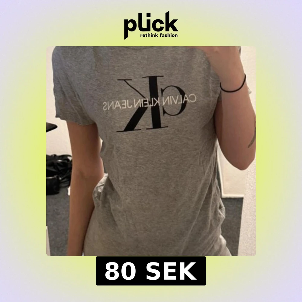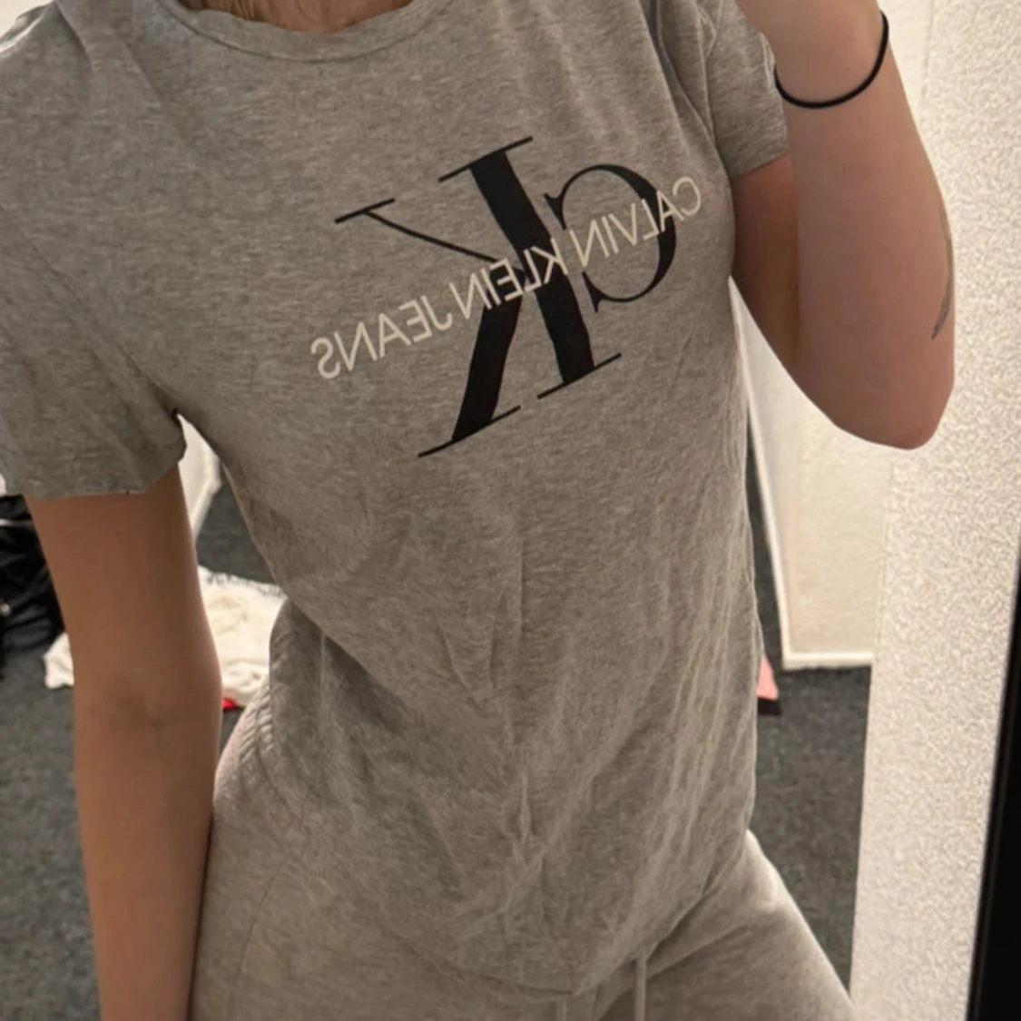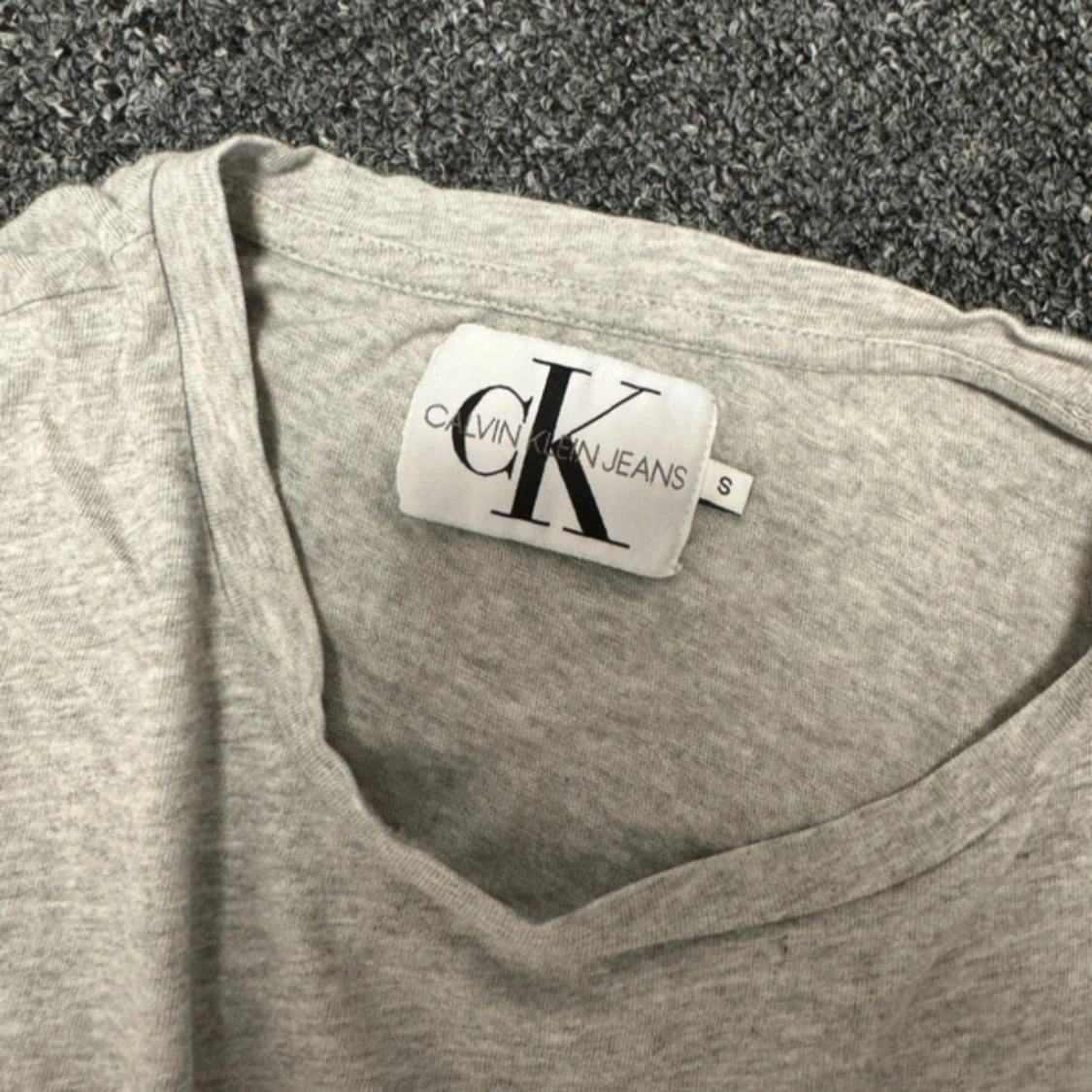 Säljer en klassisk grå t-shirt från Calvin Klein Jeans med stor svart CK-logga och vit text framtill. T-shirten har rund halsringning och korta ärmar. Perfekt till jeans eller shorts för en enkel och stilren look.