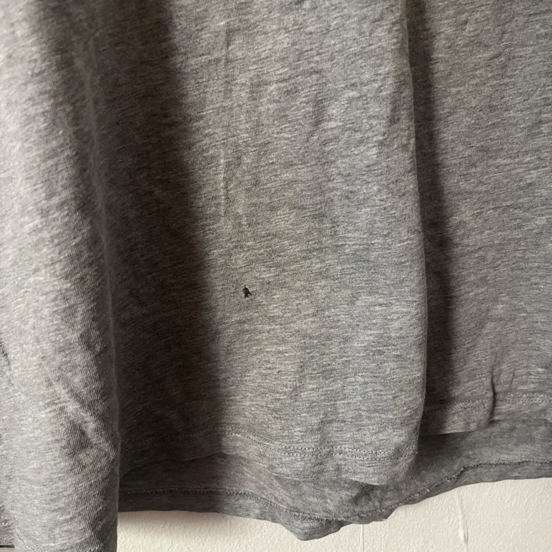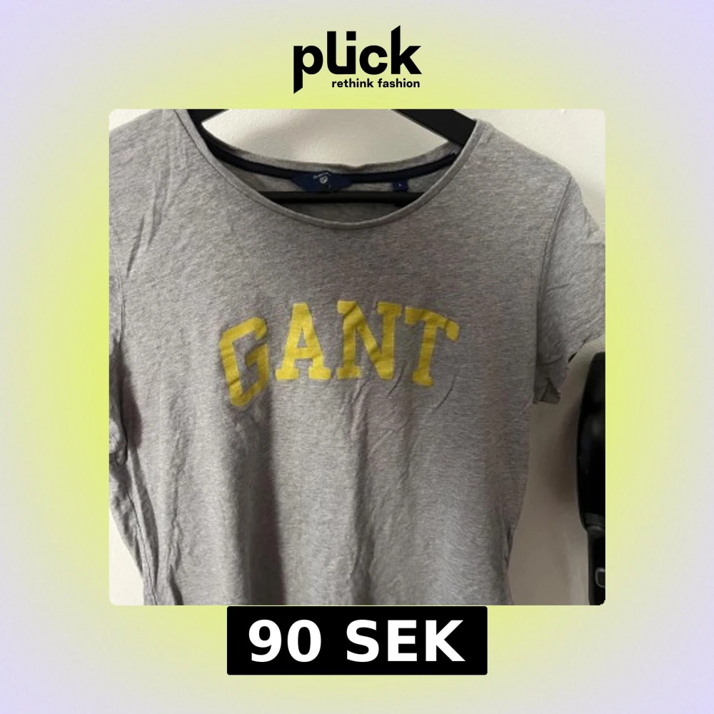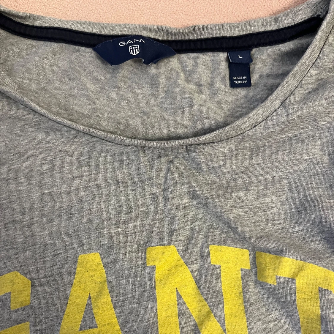 Säljer en grå t-shirt från GANT med gult tryck på framsidan. Köpt från Zalando, den har endast en liten liten fläck som syns på tredje bilden annars ingenting. Strl L, den har krympt ganska mycket så passar mer som en S nu