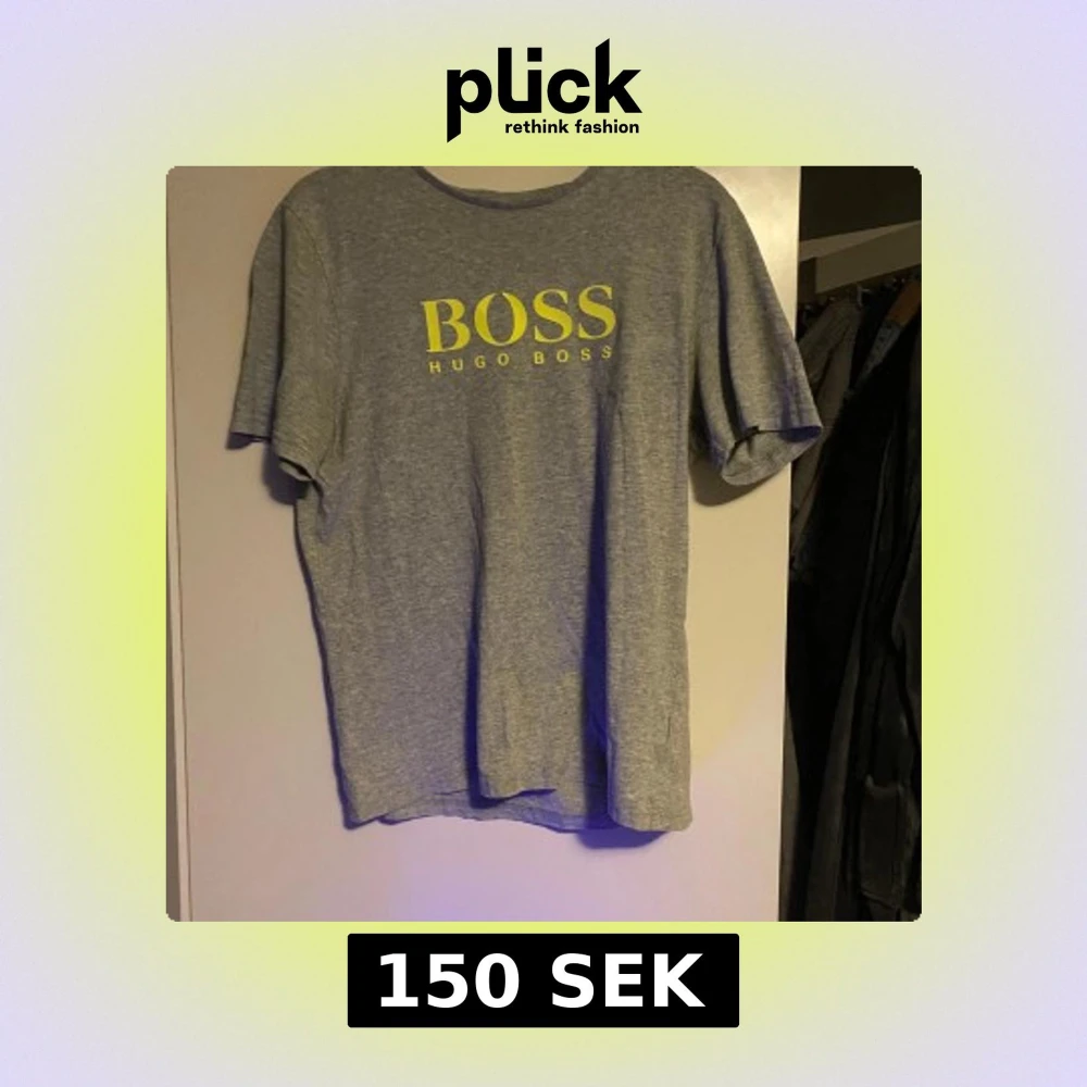 Snygg grå t-shirt från Hugo Boss med gul logga tryckt på framsidan. 1 litet hål i varje armhåla och loggan har spruckit på ett ställe